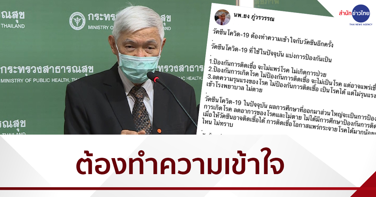 นพ.ยง ภู่วรวรรณ หัวหน้าศูนย์เชี่ยวชาญเฉพาะทางด้านไวรัสวิทยาคลินิก โพสต์เฟซบุ๊กชี้ต้องทำความเข้าใจกับวัคซีนอีกครั้ง พร้อมระบุว่าวัคซีนโควิด-19 ที่ใช้ในปัจจุบัน แบ่งการป้องกันเป็น ดังนี้