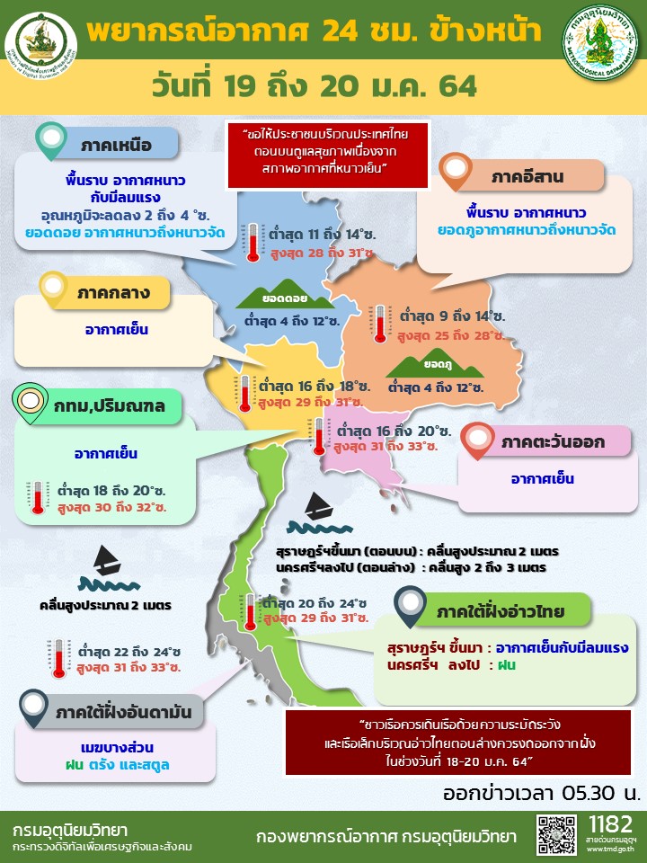 สำหรับมรสุมตะวันออกเฉียงเหนือที่พัดปกคลุมอ่าวไทยและภาคใต้มีกำลังแรง ทำให้คลื่นลมบริเวณอ่าวไทยมีกำลังแรงขึ้น โดยอ่าวไทยตอนล่างมีคลื่นสูง 2-3 เมตร ขอให้ชาวเรือเดินเรือด้วยความระมัดระวัง และเรือเล็กบริเวณอ่าวไทยตอนล่างควรงดออกจากฝั่งในช่วงวันที่ 19-20 ม.ค. 64