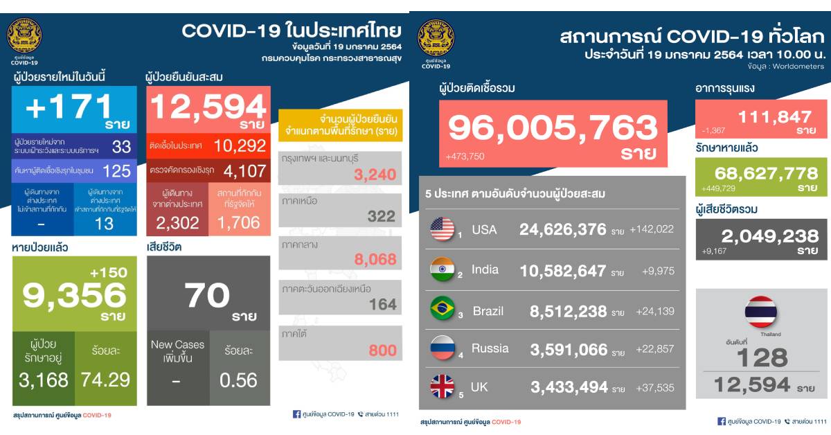 กทม. 19 ม.ค. – ศูนย์ข้อมูล COVID-19 รายงานสถานการณ์การติดเชื้อ COVID-19 ในประเทศ วันอังคารที่ 19 มกราคม 2564 พบผู้ป่วยรายใหม่ 171 ราย ผู้ป่วยยืนยันสะสม 12,594 ราย รักษาหายเพิ่ม 150 ราย รวมหายป่วยแล้ว 9,356 ราย ยังรักษาอยู่ในโรงพยาบาล 3,168 ราย เสียชีวิตสะสม 70 ราย