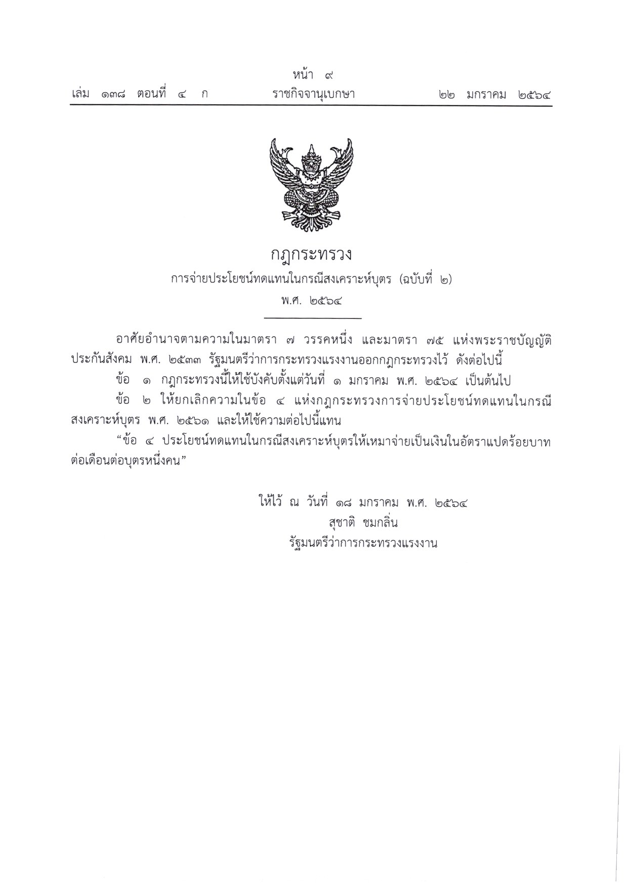 กรุงเทพฯ 23 ม.ค. – ราชกิจจานุเบกษา เผยแพร่กฎกระทรวงแรงงาน ปรับเพิ่มการจ่ายเงินสงเคราะห์บุตรเป็น 800 บาท/เดือน มีผลบังคับใช้แล้วตั้งแต่วันที่ 1 ม.ค.64