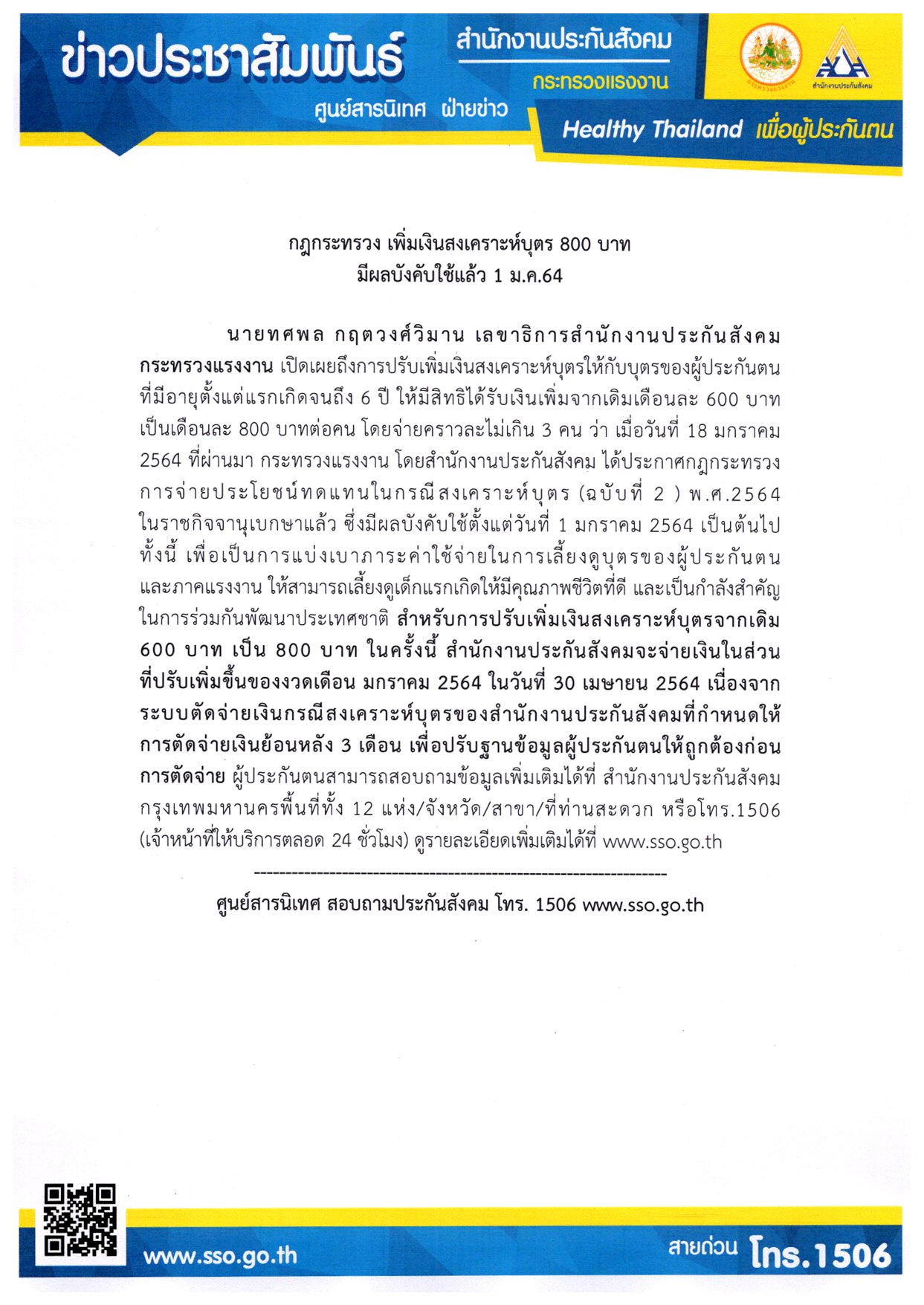 สำหรับการปรับเพิ่มเงินสงเคราะห์บุตรจากเดิม 600 บาท เป็น 800 บาท ในครั้งนี้ สำนักงานประกันสังคมจะจ่ายเงินในส่วนที่ปรับเพิ่มขึ้นของงวดเดือนมกราคม 2564 ในวันที่ 30 เมษายน 2564 เนื่องจากระบบตัดจ่ายเงินกรณีสงเคราะห์บุตรของสำนักงานประกันสังคมที่กำหนดให้การตัดจ่ายเงินย้อนหลัง 3 เดือน เพื่อปรับฐานข้อมูลผู้ประกันตนให้ถูกต้องก่อน การตัดจ่าย ผู้ประกันตนสามารถสอบถามข้อมูลเพิ่มเติมได้ที่สำนักงานประกันสังคมกรุงเทพมหานครพื้นที่ทั้ง 12 แห่ง/จังหวัด/สาขา/ที่ท่านสะดวก หรือโทร.1506 (เจ้าหน้าที่ให้บริการตลอด 24 ชั่วโมง) ดูรายละเอียดเพิ่มเติมได้ที่ www.sso.go.th. – สำนักข่าวไทย