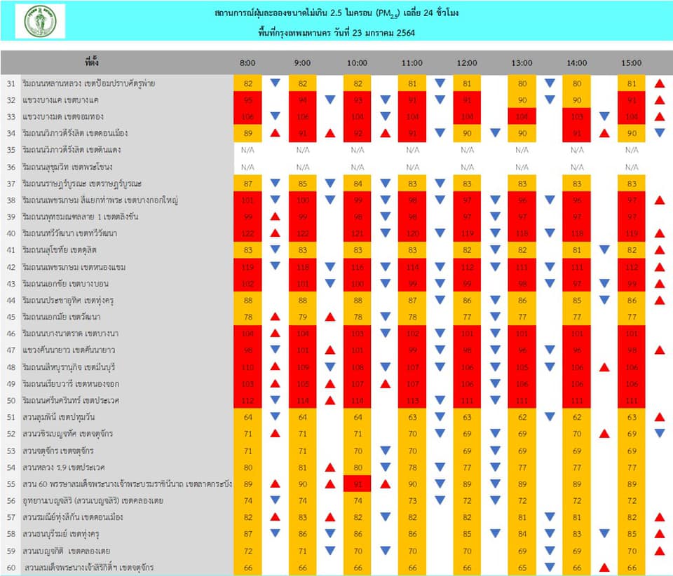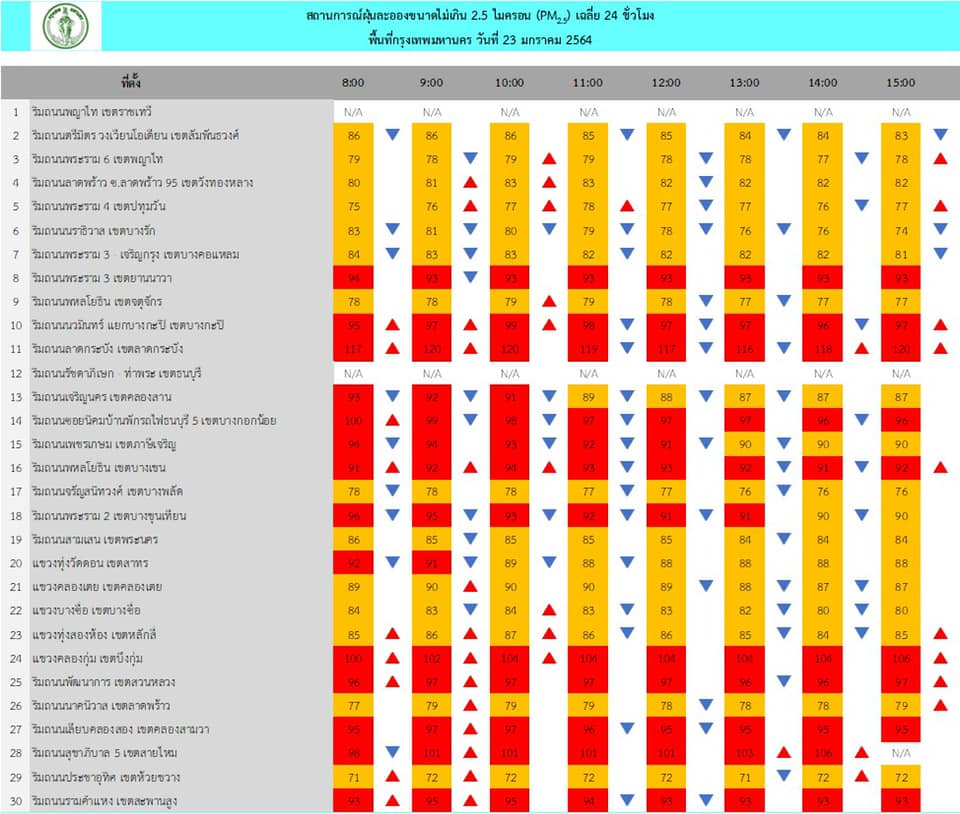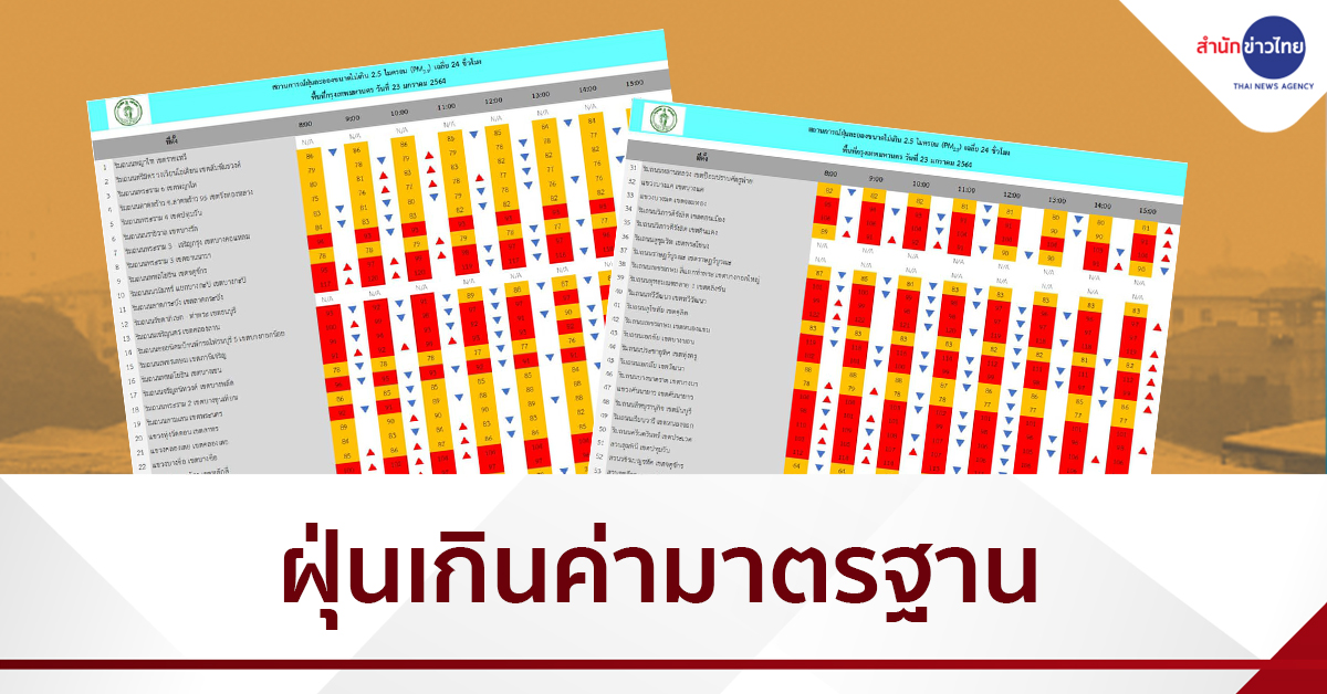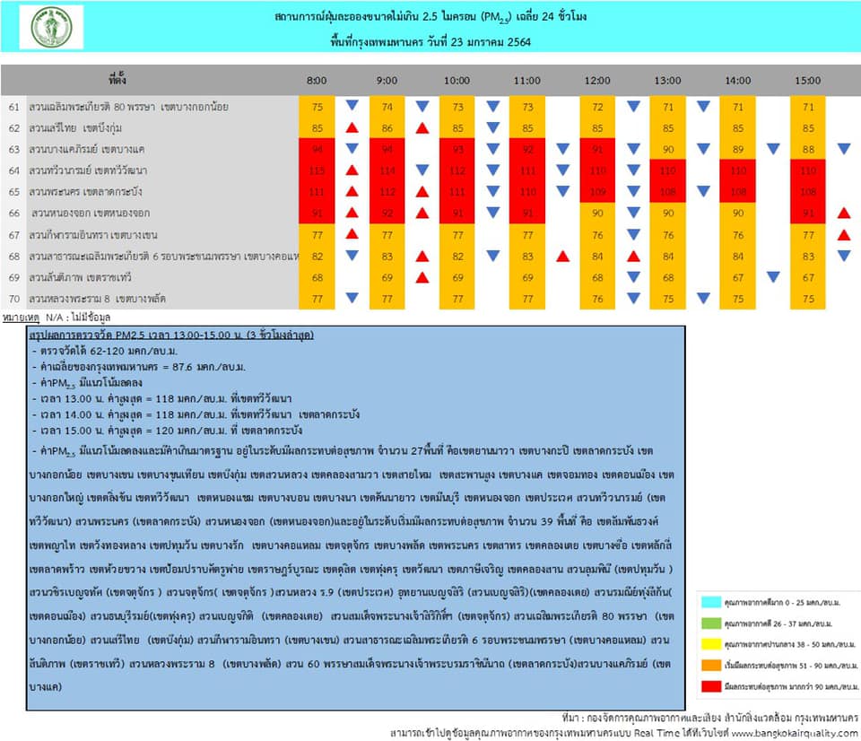 • ค่าPM2.5 มีแนวโน้มลดลงแต่มีค่าเกินมาตรฐาน อยู่ในระดับเริ่มมีผลกระทบต่อสุขภาพ จำนวน 48 พื้นที่ คือ เขตสัมพันธวงศ์ เขตพญาไท เขตวังทองหลาง เขตปทุมวัน เขตยานนาวา เขตจตุจักร เขตบางกะปิ เขตลาดกระบัง เขตคลองสาน เขตบางกอกน้อย เขตภาษีเจริญ เขตบางเขน เขตบางพลัด เขตบางขุนเทียน เขตพระนคร เขตสาทร เขตคลองเตย เขตบางซื่อ เขตหลักสี่ เขตบึงกุ่ม เขตสวนหลวง เขตลาดพร้าว เขตคลองสามวา เขตห้วยขวาง เขตสะพานสูง เขตป้อมปราบศัตรูพ่าย เขตบางแค เขตจอมทอง เขตดอนเมือง เขตราษฎร์บูรณะ เขตบางกอกใหญ่ เขตตลิ่งชัน เขตทวีวัฒนา เขตดุสิต เขตหนองแขม เขตบางบอน เขตทุ่งครุ เขตวัฒนา เขตบางนา เขตคันนายาว เขตมีนบุรี เขตหนองจอก เขตประเวศ สวน 60 พรรษาสมเด็จพระนางเจ้าพระบรมราชินีนาถ (เขตลาดกระบัง) สวนรมณีย์ทุ่งสีกัน (เขตดอนเมือง) สวนเสรีไทย (เขตบึงกุ่ม) สวนทวีวนารมย์ (เขตทวีวัฒนา) สวนพระนคร (เขตลาดกระบัง) สวนหนองจอก (เขตหนองจอก) สวนกีฬารามอินทรา (เขตบางเขน) .-สำนักข่าวไทย