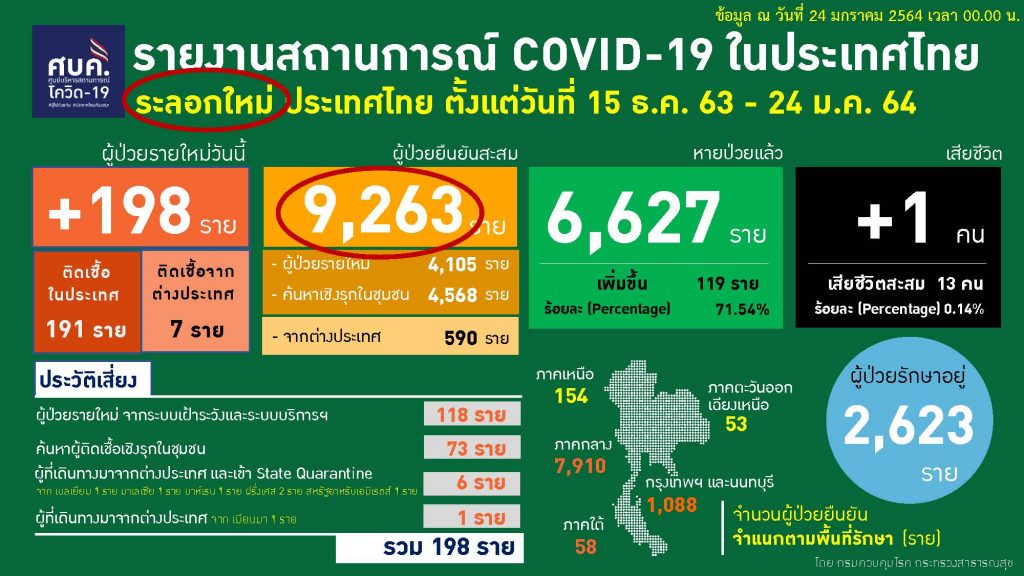 แพทย์หญิงอภิสมัย ศรีรังสรรค์ รองโฆษกศูนย์บริหารสถานการณ์โควิด-19 (ศบค.) แถลงสถานการณ์โควิด-19 ประจำวันอาทิตย์ 24 ม.ค.64 ว่า วันนี้พบผู้ติดเชื้อรายใหม่ 198 ราย แบ่งเป็นผู้ติดเชื้อภายในประเทศ 191 ราย ติดเชื้อจากต่างประเทศ 7 ราย ทำให้ยอดผู้ป่วยยืนยันสะสมที่ 13,500 ราย หายป่วยแล้ว 10,567 ราย และวันนี้มีผู้เสียชีวิตเพิ่ม 1 ราย ทำให้ยอดเสียชีวิตสะสมที่ 73 ราย สำหรับการติดเชื้อโควิด-19 ในระลอกใหม่ ตั้งแต่วันที่ 15 ธ.ค.63 – 24 ม.ค.64 มีผู้ป่วยยืนยันสะสม 9,263 ราย หายป่วยแล้ว 6,627 ราย เสียชีวิตสะสม 13 ราย