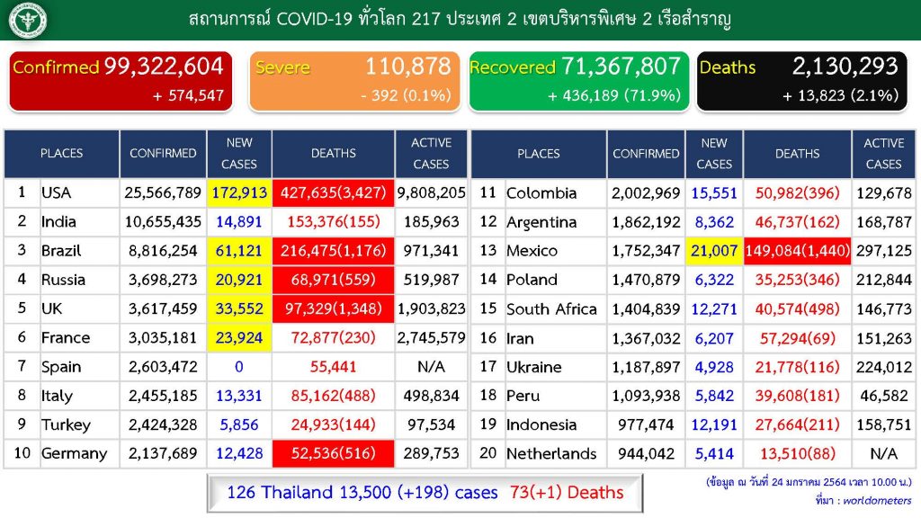 สำหรับสถานการณ์ทั่วโลก ยอดผู้ติดเชื้อใกล้ 100 ล้านคนแล้ว สะสมที่ 99,322,604 ราย อาการรุนแรง 110,878 ราย รักษาหายแล้ว 71,367,807 ราย เสียชีวิต 2,130,293 ราย อันดับประเทศที่มีผู้ติดเชื้อสูงสุด 1. สหรัฐอเมริกา จำนวน 25,566,789 ราย 2. อินเดีย จำนวน 10,655,435 ราย 3. บราซิล จำนวน 8,816,254 ราย 4. รัสเซีย จำนวน 3,698,273 ราย 5. สหราชอาณาจักร จำนวน 3,617,459 ราย และประเทศไทย อยู่ในอันดับที่ 126 ซึ่งต่างจากเมื่อวาน อยู่ที่ลำดับ 128 การที่เราติดตามสถานการณ์โลกถือว่ามีประโยชน์ จะได้นำมาเป็นตัวอย่างเพื่อไม่ให้สถานการณ์ในประเทศไทยไปไกลถึงจุดนั้น.-สำนักข่าวไทย