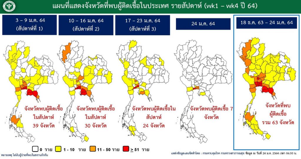 ทั้งนี้ จากแผนที่แสดงรายจังหวัดที่พบผู้ติดเชื้อในประเทศ รายสัปดาห์ ตั้งแต่วันที่ 18 ธ.ค. – 24 ม.ค. 64 พบผู้ติดเชื้อรวม 63 จังหวัด และมีจำนวนลดลงต่อเนื่อง จนวันนี้ 24 ม.ค.64 เหลือผู้ติดเชื้อ 7 จังหวัด ถือเป็นแนวโน้มที่ดี จากการตรวจค้นหาเชิงรุก ตั้งแต่วันที่ 19 มกราคม 2564 ในจังหวัดสมุทรสาครที่ผ่านมา พบผู้ติดเชื้อ กว่า 5,000 ราย จากการตรวจเชิงรุกกว่า 70,000 รายนั้น อีก 5 วันถัดจากนี้ จะมีการตรวจเชิงรุกเพิ่มมากขึ้น ในโรงงานขนาดเล็ก กลาง ใหญ่ ตลาด ชุมชน หอพักคนงาน โดยต้องตรวจให้เสร็จสิ้นภายใน 1 สัปดาห์ เพื่อนำไปสู่การวางแผนผ่อนคลายมาตรการต่างๆ และลดจำนวนผู้ติดเชื้อน้อยลง และ 1-7 ก.พ.64 จะเก็บรายละเอียดในพื้นที่ที่ยังมีความเสี่ยง และคาดว่า 8-15 ก.พ.64 การติดเชื้อจะเบาบางลง ซึ่งจ.สมุทรสาครจะเป็นตัวอย่าง ที่จะทำแบบนี้ทุกจังหวัดทั่วประเทศ โดยใช้จ.สมุทรสาครเป็นโมเดล ในการกำหนดระยะเวลาผ่อนคลายมาตรการ หาก 25-31 ม.ค.64 ทุกพื้นที่ช่วยกันเฝ้าระวังมาตรการอย่างเข้มข้น และในสัปดาห์หน้า ตัวเลขติดเชื้อยังดีอย่างต่อเนื่อง ภายในต้นเดือนก.พ.64 สถานศึกษา อาจจะเปิดการเรียนการสอนในบางพื้นที่ ส่วนร้านอาหาร สถานบริการต่างๆ ให้ติดตามอย่างใกล้ชิด คาดว่า ในช่วงสัปดาห์หน้าจะมีรายละเอียดของการผ่อนคลายมาตรการบางอย่างออกมา ทั้งนี้ขอความร่วมมือประชาชน อย่าการ์ดตก