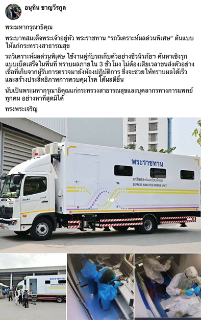นายอนุทิน ชาญวีรกูล รองนายกรัฐมนตรีและรัฐมนตรีว่าการกระทรวงสาธารณสุข โพสต์เฟซบุ๊กส่วนตัว “อนุทิน ชาญวีรกูล” เผยพระบาทสมเด็จพระเจ้าอยู่หัว พระราชทาน “รถวิเคราะห์ผลด่วนพิเศษ” ต้นแบบ ให้แก่กระทรวงสาธารณสุข