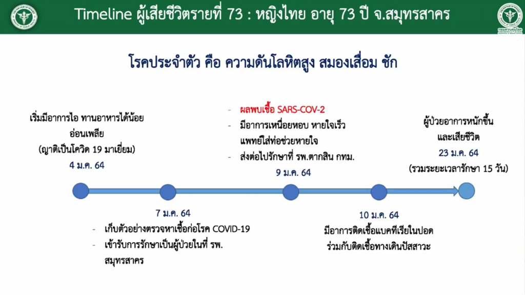 นพ.โอภาส ยังกล่าวว่า ส่วนผู้เสียชีวิตที่เป็นหญิง 73 ปี รายล่าสุดนี้ พบว่าการติดเชื้อจากผู้ที่ป่วยที่ไม่ได้แสดงอาการ โดยเป็นญาติที่มีการติดเชื้อและมาเยี่ยมที่บ้าน ประกอบกับมีโรคประจำตัวอยู่เดิม เกี่ยวกับปอด ทำให้ต้องใส่เครื่องช่วยหายใจตั้งแต่วันที่ 9 มกราคมที่ผ่านมา แต่อาการติดเชื้อโควิดจะดีขึ้น และหายแล้ว แต่กลับพบว่ามีการติดเชื้อแทรกซ้อนแทน ทำให้เป็นสาเหตุการเสียชีวิต ดังนั้นเรื่องนี้จึงถือเป็นบทเรียนของครอบครัวที่จำช่วยกันเฝ้าระวังผู้สูงอายุในบ้าน การที่เราเดินทางไปนอกบ้านอาจป่วยไม่รู้ตัวและไม่แสดงอาการ ดังนั้นต้องมีการสวมหน้ากากอนามัยเสมอ เพื่อเป็นการป้องกันการแพร่เชื้อสู่คนอื่น