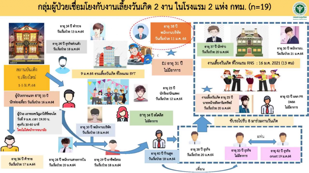 นพ.โอภาส กล่าวว่า ส่วนกรณีการสอบสวนของเคสดีเจ มะตูม พบว่าจุดเริ่มต้นมาจากเพื่อนที่ไปร่วมงานเลี้ยงของดีเจมะตูมไปสถานบันเทิงในจังหวัดเชียงใหม่ ที่เป็นข่าวและมีการติดเชื้อเกิดขึ้น ขณะเดียวกันผู้ประกาศ NBT สอบสวนโรค ก็พบว่าไปปาร์ตี้กับดีเจมะตูม. จากนั้นผู้ประกาศคนดังกล่าวยังเดินทางไปปาร์ตี้ ในอีก 3 สถานที่ ทำให้มีผู้ป่วยติดเชื้อรวม 19 คน ดังนั้นจะเห็นว่า ในพื้นที่แออัด อากาศไม่ถ่ายเท มีการเลี้ยงสังสรรค์ จัดกิจกรรมปาร์ตี้ ดื่มเครื่องดื่มแอลกอฮอล์ มีการเป่าเทียนวันเกิด ร้องเพลงกัน ล้วนแต่เป็นกิจกรรมเลี่ยงทั้งสิ้น .-สำนักข่าวไทย