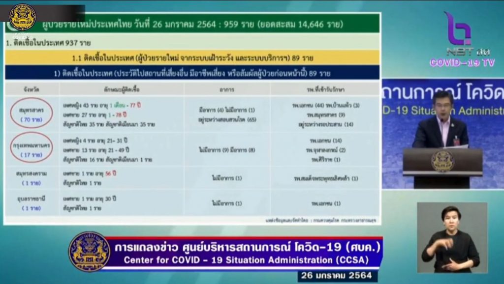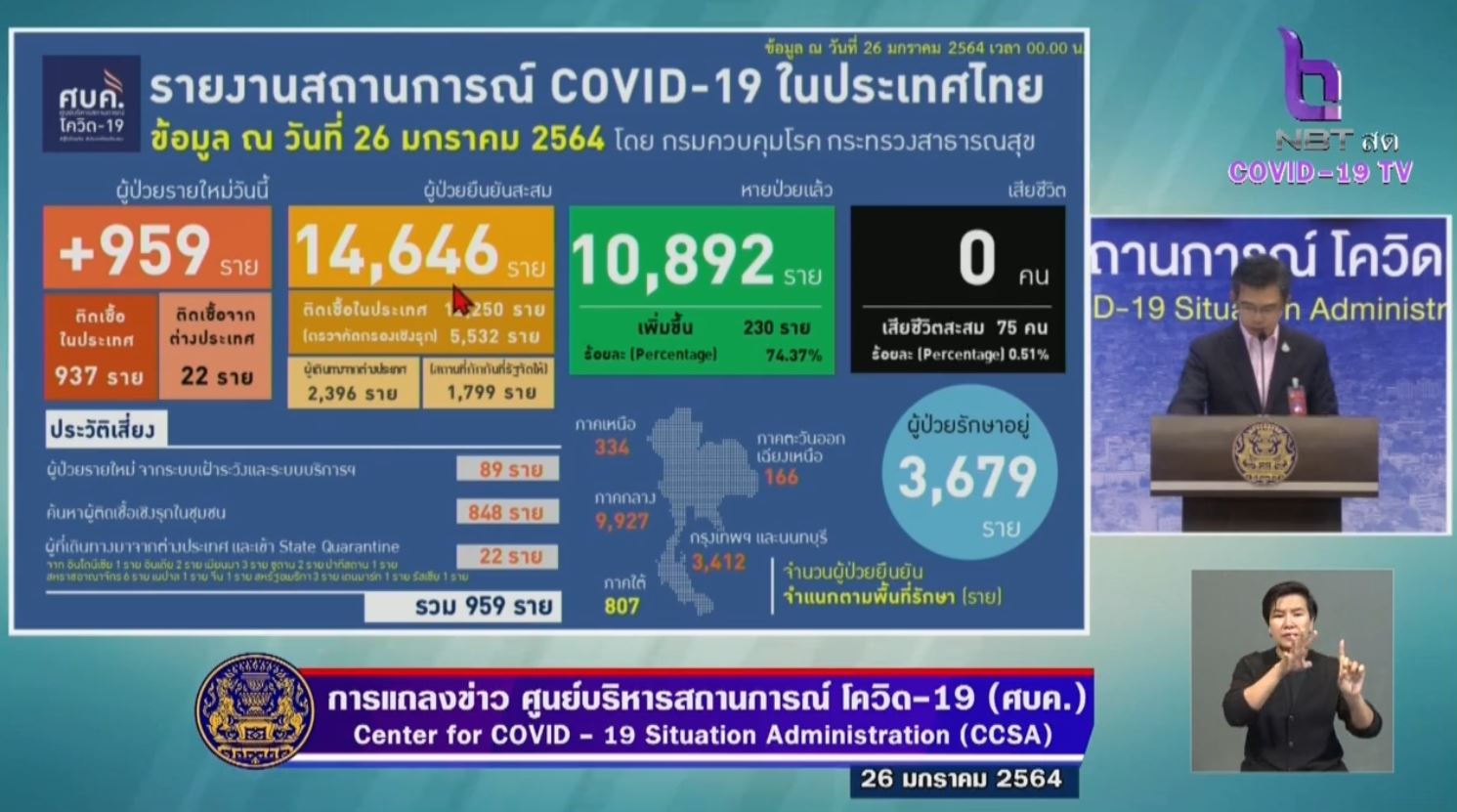 กทม. 26 ม.ค. – ศูนย์ข้อมูล COVID-19 รายงานสถานการณ์การติดเชื้อ COVID-19 ในประเทศ วันอังคารที่ 26 มกราคม 2564 พบผู้ป่วยรายใหม่ 959 ราย ผู้ป่วยยืนยันสะสม 14,646 ราย รักษาหายเพิ่ม 230 ราย หายป่วยแล้ว 10,892 ราย ยังรักษาตัวอยู่ในโรงพยาบาล 3,679 ราย เสียชีวิตสะสม 75 ราย