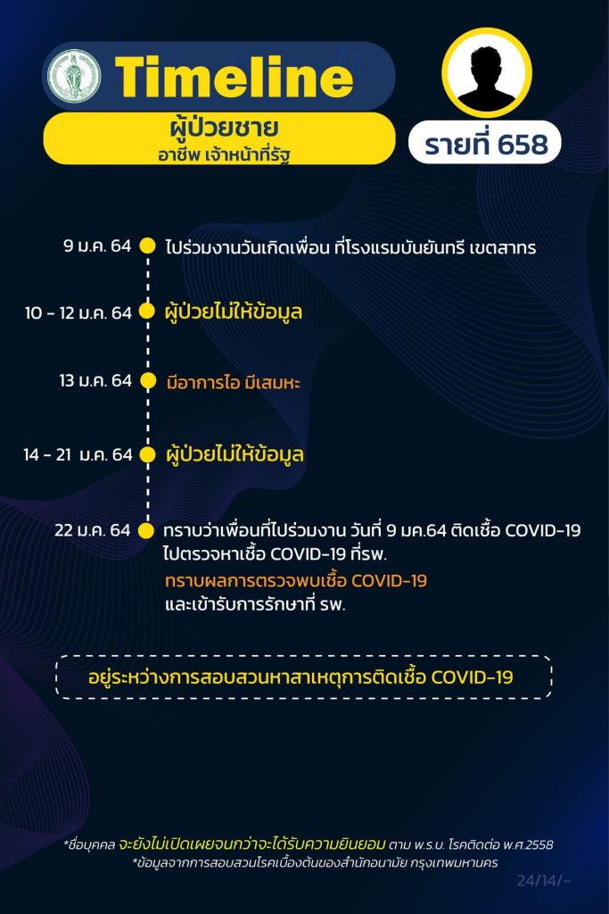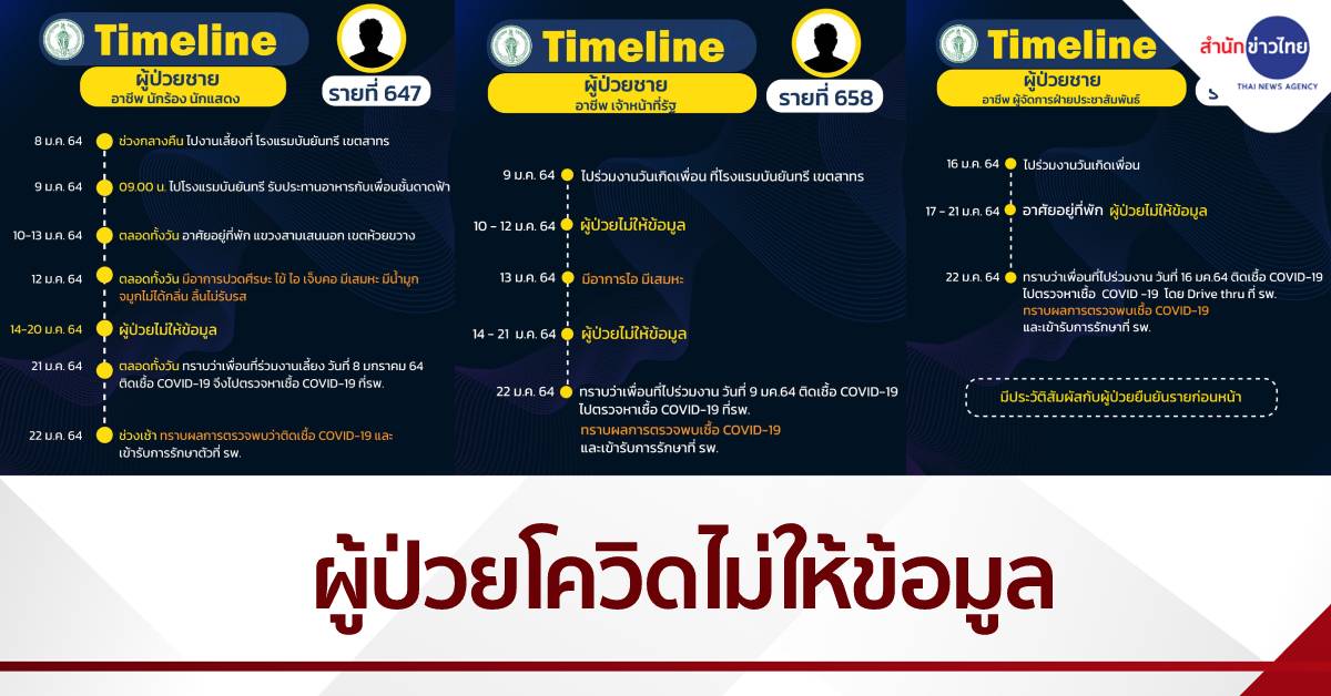 กทม. 27 ม.ค.-วันนี้ กทม. เปิดเผย Timeline ผู้ติดเชื้อโควิด-19 ที่อยู่ใน กทม. ซึ่งได้สอบสวนโรคแล้วเสร็จเพิ่มอีก 15 ราย ทั้งนี้พบว่ามีผู้ป่วย 3 ราย ไม่ให้ข้อมูลในบางช่วงเวลา มีทั้งนักร้อง นักแสดง และเจ้าหน้าที่รัฐ.-สำนักข่าวไทย