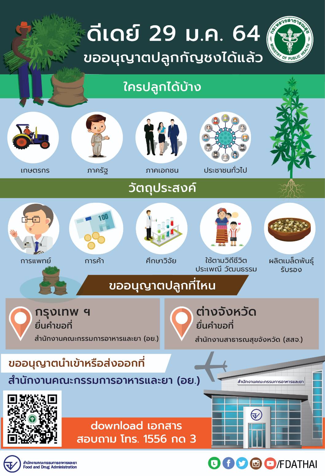 ภญ.สุภัทรา บุญเสริม รองเลขาธิการคณะกรรมการอาหารและยา เปิดเผยว่า ตามที่นโยบายของรัฐบาลและกระทรวงสาธารณสุข สนับสนุนให้ใช้ประโยชน์จากพืชกัญชง (Hemp) เพื่อสร้างมูลค่าทางเศรษฐกิจ สร้างรายได้ให้แก่ประชาชน โดยนายอนุทิน ชาญวีรกูล รองนายกรัฐมนตรีและรัฐมนตรีว่าการกระทรวงสาธารณสุข ได้ลงนามในกฎกระทรวงการขออนุญาตและการอนุญาตผลิต นำเข้า ส่งออก จำหน่าย หรือมีไว้ครอบครองซึ่งยาเสพติดให้โทษประเภท 5 เฉพาะกัญชง (Hemp) พ.ศ. 2563 ซึ่งจะมีผลใช้บังคับในวันที่ 29 มกราคม 2564 ทุกภาคส่วน ทั้งเกษตรกร ภาครัฐ เอกชน และประชาชนทั่วไป สามารถขออนุญาตปลูกได้ทุกวัตถุประสงค์ ตั้งแต่การค้า การแพทย์ การศึกษา วิจัย การใช้ตามวิถีชีวิต ประเพณี วัฒนธรรม หรือผลิตเมล็ดพันธุ์รับรอง ซึ่งสามารถนำส่วนต่าง ๆ ของกัญชงไปแปรรูปและสร้างมูลค่าเพิ่มเป็นผลิตภัณฑ์สุขภาพ เช่น ช่อดอกนำไปผลิตยา สารสกัดจากกัญชง, ใบนำไปผลิตอาหาร ผลิตภัณฑ์สมุนไพร เครื่องสำอาง, น้ำมันจากเมล็ดกัญชงนำไปผลิตเป็นผลิตภัณฑ์เสริมอาหาร ผลิตภัณฑ์สมุนไพร เครื่องสำอาง, สารสกัดจากกัญชงนำไปผลิตเป็นเครื่องดื่ม เครื่องสำอาง และผลิตภัณฑ์สมุนไพร เป็นต้น