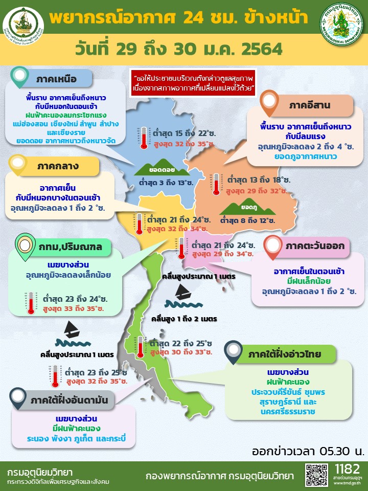 กรมอุตุนิยมวิทยา พยากรณ์อากาศ 24 ชั่วโมงข้างหน้า บริเวณความกดอากาศสูงหรือมวลอากาศเย็นกำลังปานกลางจากประเทศจีนได้แผ่ลงมาปกคลุมภาคตะวันออกเฉียงเหนือของประเทศไทยแล้ว และจะแผ่ขยายเข้าปกคลุมภาคกลาง และภาคตะวันออก ในเวลาต่อไป ทำให้บริเวณดังกล่าวมีอากาศหนาวเย็นลง กับมีลมแรง โดยภาคตะวันออกเฉียงเหนือ อุณหภูมิลดลง 2-4 องศาเซลเซียส ส่วนภาคกลาง ภาคตะวันออก รวมทั้งกรุงเทพมหานคร และปริมณฑล อุณหภูมิลดลง 1-2 องศาเซลเซียส