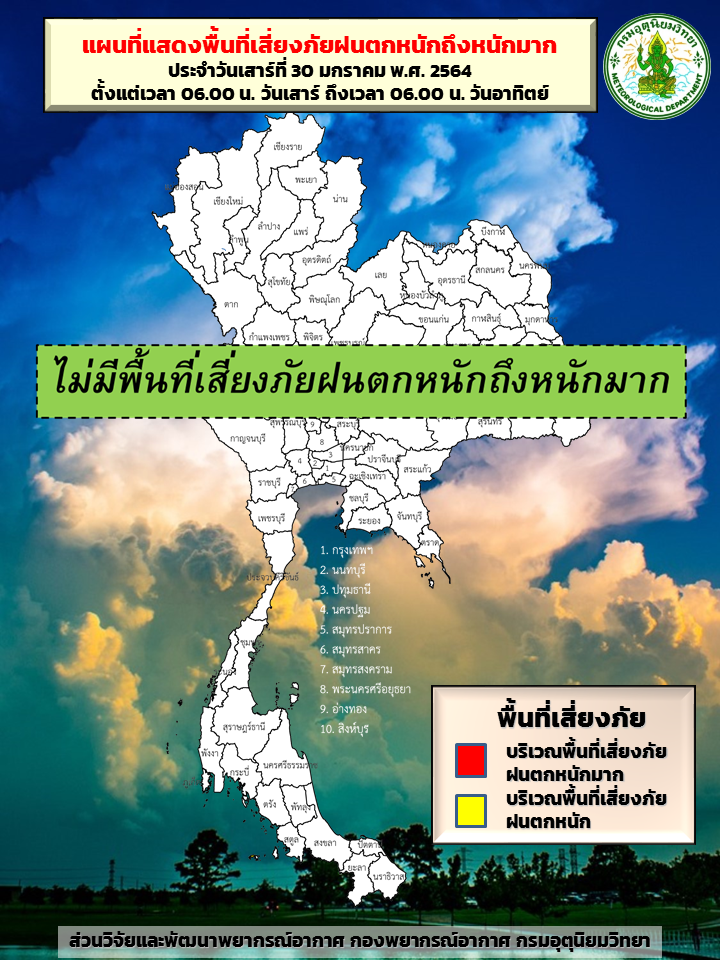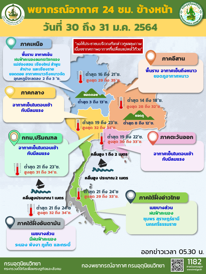 กรมอุตุนิยมวิทยา พยากรณ์อากาศ 24 ชั่วโมงข้างหน้า บริเวณความกดอากาศสูงหรือมวลอากาศเย็นกำลังปานกลางปกคลุมภาคตะวันออกเฉียงเหนือ ภาคกลาง ภาคตะวันออก รวมทั้งกรุงเทพมหานครและปริมณฑล ทำให้บริเวณภาคตะวันออกเฉียงเหนือมีอากาศเย็นถึงหนาวกับมีลมแรง ส่วนภาคกลาง ภาคตะวันออก รวมทั้งกรุงเทพมหานครและปริมณฑล มีอากาศเย็นในตอนเช้า ขอให้ประชาชนบริเวณดังกล่าวดูแลสุขภาพเนื่องจากสภาพอากาศที่เปลี่ยนแปลงไว้ด้วย สำหรับมรสุมตะวันออกเฉียงเหนือที่พัดปกคลุมอ่าวไทยและภาคใต้จะมีกำลังแรงขึ้น ทำให้ภาคใต้มีฝนเพิ่มขึ้น และคลื่นลมบริเวณอ่าวไทยมีกำลังแรงขึ้น โดยอ่าวไทยตอนล่างตั้งแต่จังหวัดสงขลาลงไป ทะเลมีคลื่นสูงประมาณ 2 เมตร บริเวณที่มีฝนฟ้าคะนองคลื่นสูงมากกว่า 2 เมตร ขอให้ชาวเรือเดินเรือด้วยความระมัดระวัง และหลีกเลี่ยงบริเวณที่มีฝนฟ้าคะนองในช่วงวันที่ 30 – 31 มกราคม 2564 คลื่นกระแสลมฝ่ายตะวันตกจะเคลื่อนผ่านประเทศเมียนมาเข้าปกคลุมบริเวณภาคเหนือตอนบน ลักษณะเช่นนี้ทำให้บริเวณดังกล่าวมีฝนฟ้าคะนองและลมกระโชกแรงเกิดขึ้นเป็นบางพื้นที่ในระยะแรก หลังจากนั้นอุณหภูมิจะลดลง 2-3 องศาเซลเซียส