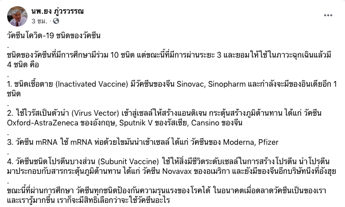 30 ม.ค.-ศ.นพ.ยง ภู่วรวรรณ หัวหน้าศูนย์เชี่ยวชาญเฉพาะทางด้านไวรัสวิทยาคลินิก คณะแพทยศาสตร์ จุฬาลงกรณ์มหาวิทยาลัย เปิดเผยเกี่ยวกับชนิดของวัคซีนโควิด-19 มีการศึกษาร่วม 10 ชนิด แต่ขณะนี้ที่ผ่านระยะ 3 และยอมให้ใช้ในภาวะฉุกเฉินแล้ว มี 4 ชนิด
