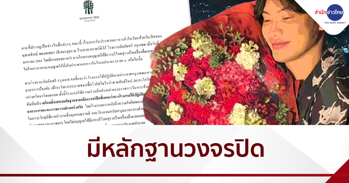 กรุงเทพฯ 30 ม.ค.-โรงแรมบันยันทรี ออกเอกสารแถลงยืนยันเคร่งมาตรการ กทม. มีหลักฐานวงจรปิด ไม่ได้ขายเครื่องดื่มแอลกอฮอล์ให้กลุ่มดีเจมะตูม พร้อมให้ตรวจสอบ