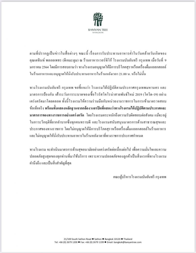 ตามที่ปรากฏเป็นข่าวในสื่อต่างๆ ขณะนี้ เรื่องการรับประทานอาหารค่ำในวันคล้ายวันเกิดของดีเจมะตูม ณ ร้านอาหารเวอร์ทิโก้ โรงแรมบันยันทรี กรุงเทพ เมื่อวันที่ 9 มกราคม 2564 โดยมีการสอบถามว่า ทางโรงแรมอนุญาตให้มีการบริโภคสุราหรือเครื่องดื่มแอลกอฮอล์ในร้านอาหารและอนุญาตให้นั่งรับประทานอาหารในร้าน หลังเวลา 21.00 น. หรือไม่นั้น