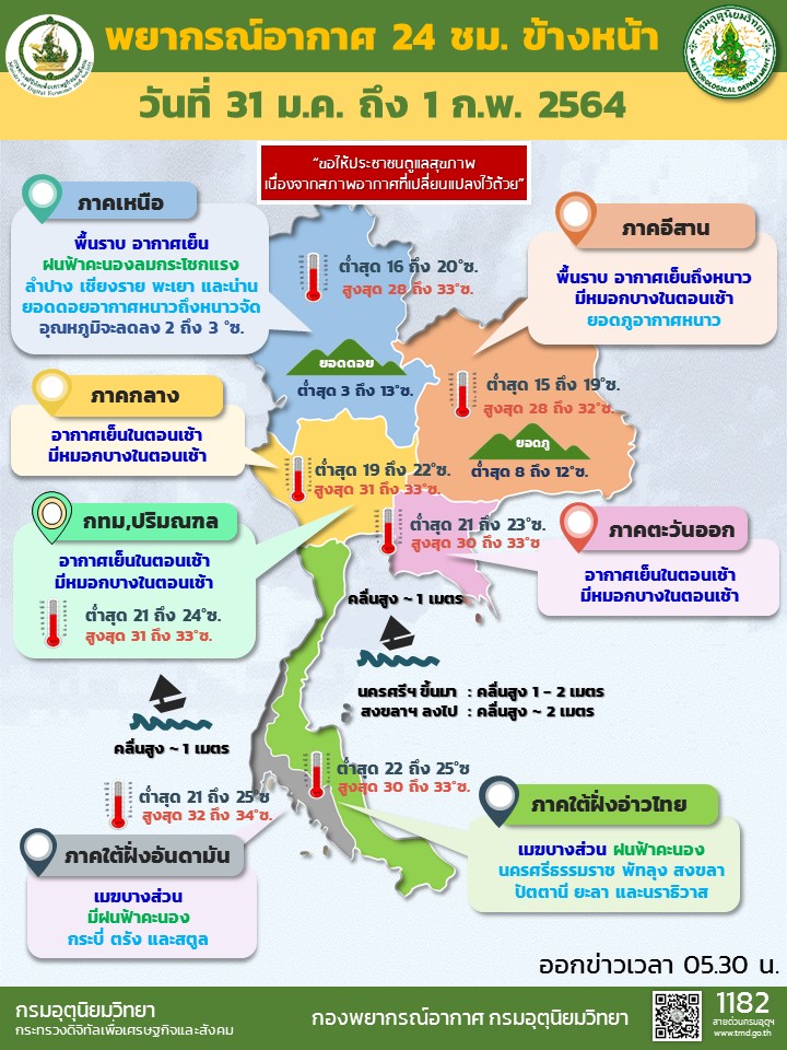 กทม. 31 ม.ค.-กรมอุตุฯ เผยภาคเหนือ ฝนฟ้าคะนอง จากนั้นอุณหภูมิจะลดลง 2-3 องศาฯ อีสาน ภาคกลาง ภาคตะวันออก อากาศเย็นกับมีหมอกบางในตอนเช้า ส่วนคลื่นลมอ่าวไทยตอนล่างตั้งแต่ จ.สงขลาลงไป ทะเลมีคลื่นสูงประมาณ 2 เมตร