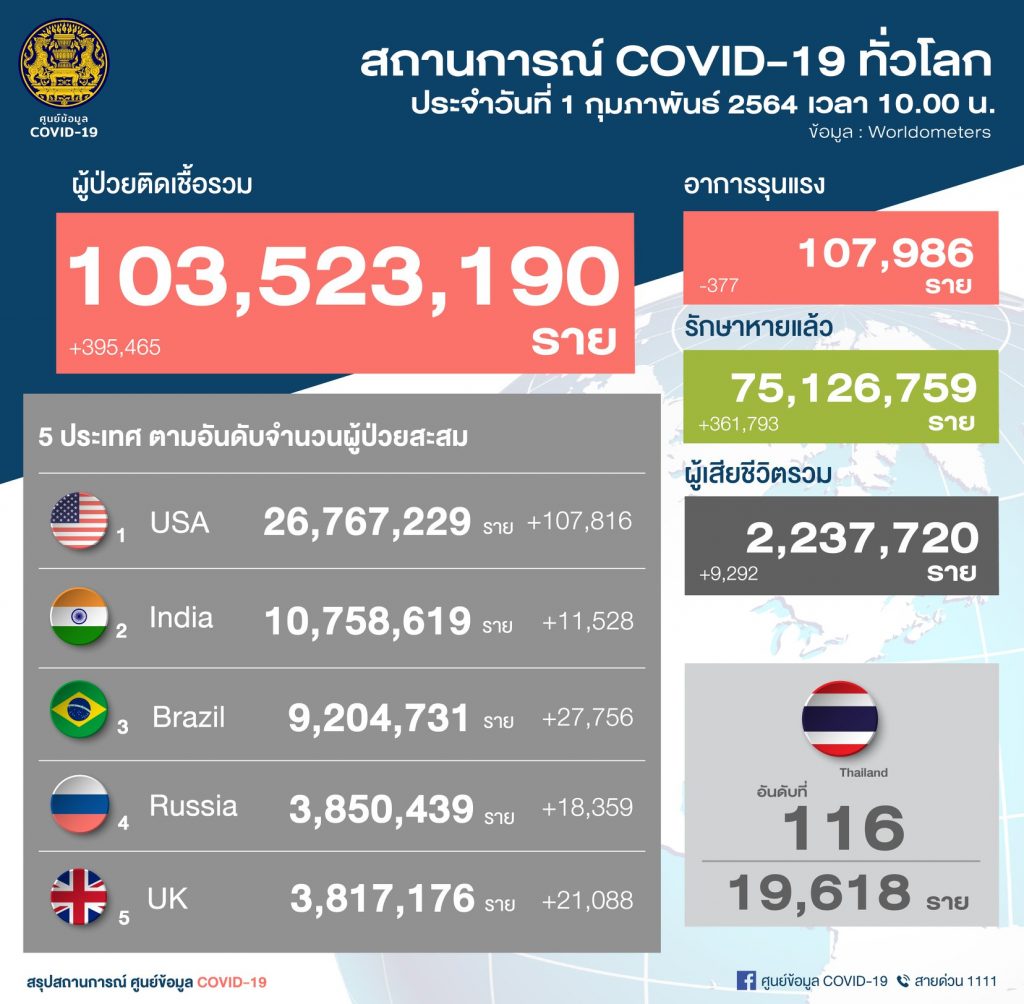 ยอดผู้ติดเชื้อรวม 103,523,190 ราย