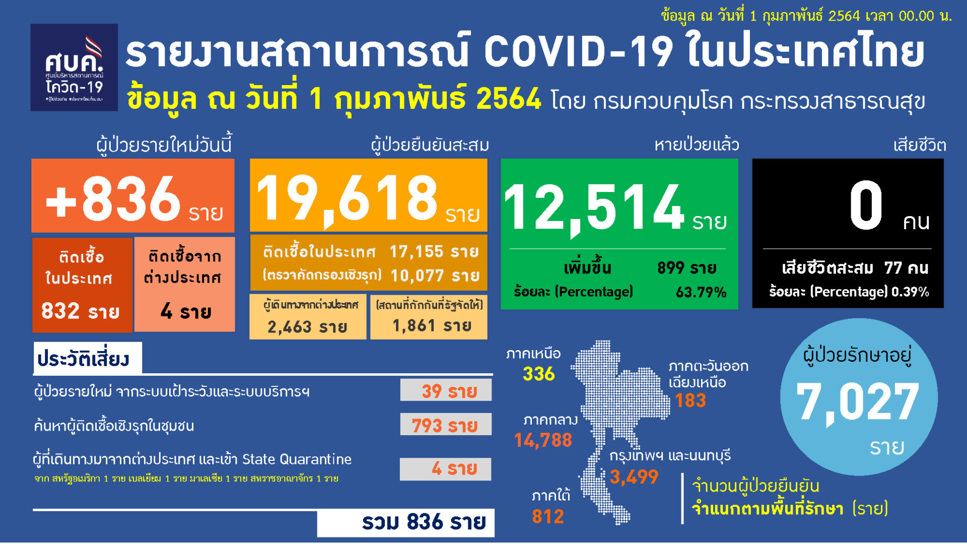 กทม. 1 ก.พ. – ศูนย์ข้อมูล COVID-19 รายงานสถานการณ์การติดเชื้อ COVID-19 ในประเทศ วันจันทร์ที่ 1 กุมภาพันธ์ 2564 พบผู้ป่วยรายใหม่ 836 ราย ผู้ป่วยยืนยันสะสม 19,618 ราย รักษาหายเพิ่ม 899 ราย รวมหายป่วยแล้ว 12,514 ราย ยังรักษาตัวอยู่ในโรงพยาบาล 7,027 ราย เสียชีวิตสะสม 77 ราย