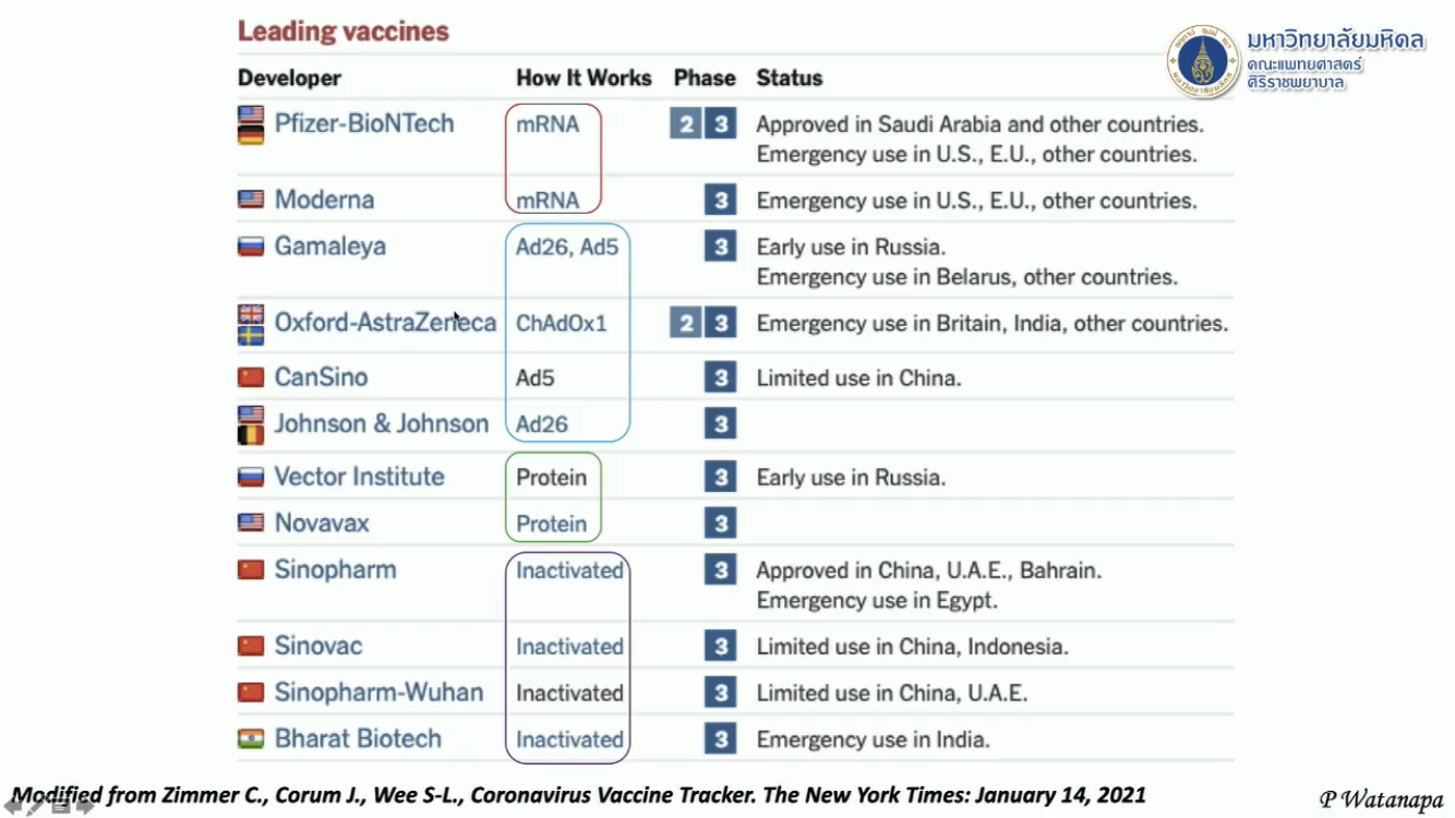 นพ.ประสิทธิ์ กล่าวว่า สำหรับเทคโนโลยีของวัคซีนที่มีการฉีดกันขณะนี้ ส่วนใหญ่เป็น mRNA รองลงมา ไวรัลเวกเตอร์ รวมถึงวัคซีนเชื้อตาย ซึ่งส่วนใหญ่ของประเทศที่มีการฉีดวัคซีน พบว่าส่วนใหญ่มีการฉีดวัคซีนทุกประเภท ไม่จำกัดแค่เทคโนโลยีใดเทคโนโลยีหนึ่ง และอาการจากวัคซีนก็พบว่า กราฟอัตราการป่วยในกลุ่มประเทศฉีดวัคซีน ทั้งสหรัฐอเมริกา สหราชอาณาจักรลดลง แต่อัตราตายยังไม่ชัดเจน แต่มีแนวโน้มลดลง พร้อมยกตัวอย่าง สหราชอาณาจักร ฉีดวัคซีนเป็นประเทศแรกในโลกตั้งแต่วันที่ 8 ธ.ค. เนื่องจากปัญหาเรื่องของไวรัสมีการเปลี่ยนแปลงสายพันธุ์ จึงเริ่มฉีดก่อน โดยพบว่าอัตราป่วยค่อยๆ ลดลง เช่นเดียวกับ สหรัฐอเมริกา ที่เริ่มฉีดวัคซีนเมื่อวันที่ 14 ธ.ค. อัตราการป่วยก็ค่อยๆ ลดลงเช่นกัน