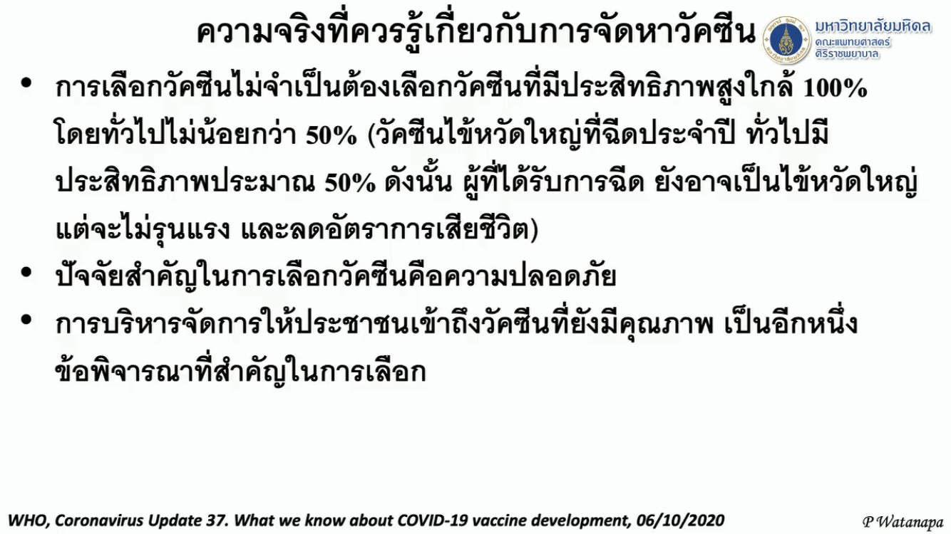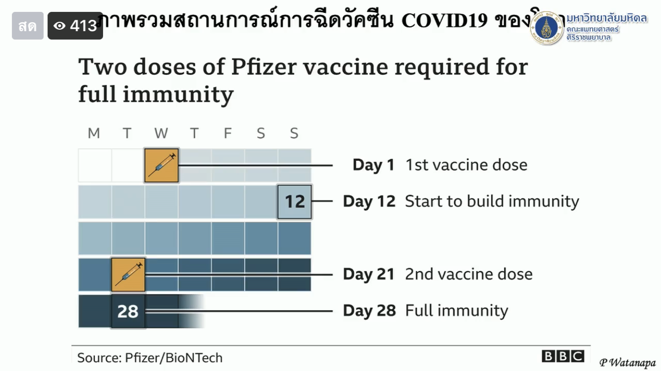 นพ.ประสิทธิ์ วัฒนาภา คณบดีคณะแพทยศาสตร์ศิริราช มหาวิทยาลัยมหิดล กล่าวถึงการติดตามประสิทธิภาพวัคซีนโควิด -19 ในหลายประเทศว่า ขณะนี้ทั่วโลกฉีดไป 100 ล้านโดส หรือรวม 46 ล้านคน โดยพบว่าสหรัฐอเมริกา ฉีดไปแล้ว 23 ล้านคน จากประชากรทั้งหมด 328 ล้านคน คิดเป็นร้อยละ 7 สหราชอาณาจักร ฉีดไปแล้ว 8.38 ล้านคน จากประชากรทั้งหมด 66 ล้านคน หรือคิดเป็นร้อยละ 12.57 อิสราเอล ฉีดไปแล้ว 1 ใน 3 ของประชากรในประเทศ หรือ 2.97 ล้านคน จากประชากรในประเทศ 8.8 ล้านคน โดยข้อมูลผลกระทบจากการฉีดวัคซีนพบว่า ก่อให้เกิดอาการเล็กน้อย ปวดบวมแดง มีไข้ เวียนศีรษะ เป็นแค่ 1-2 วัน แรก จากกนั้นอาการก็หายไป ส่วนการเสียชีวิตมีน้อยมาก ย้ำการรับวัคซีนต้องได้รับถึง 2 เข็ม ห่างกัน 3 สัปดาห์ และวัคซีนจะเริ่มสร้างภูมิคุ้มกันเมื่อผ่านพ้น 1 สัปดาห์ไปแล้ว