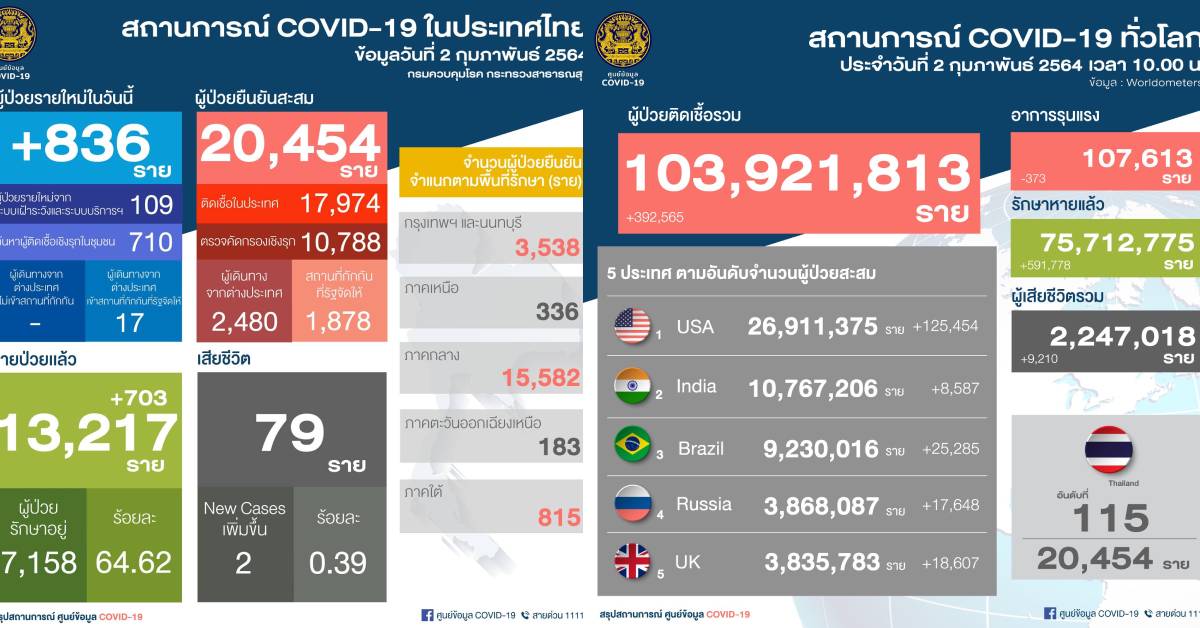 กทม. 2 ก.พ. – ศูนย์ข้อมูล COVID-19 รายงานสถานการณ์การติดเชื้อ COVID-19 ในประเทศ วันอังคารที่ 2 กุมภาพันธ์ 2564 พบผู้ป่วยรายใหม่ 836 ราย ผู้ป่วยยืนยันสะสม 20,454 ราย รักษาหายเพิ่ม 703 ราย รวมหายป่วยแล้ว 13,217 ราย ยังรักษาตัวอยู่ในโรงพยาบาล 7,158 ราย มีผู้เสียชีวิตเพิ่ม 2 ราย เสียชีวิตสะสม 79 ราย