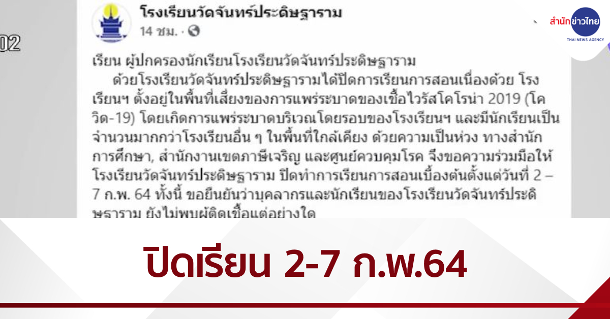 กรุงเทพฯ 3 ก.พ. – เพจเฟชบุ๊กโรงเรียนวัดจันทร์ประดิษฐาราม โพสต์ข้อความแจ้งปิดการเรียการสอนเบื้องต้นตั้งแต่วันที่ 2-7 ก.พ.64 ยืนยันบุคลากรและนักเรียนของโรงเรียนวัดจันทร์ประดิษฐาราม ยังไม่พบผู้ติดเชื้อโควิด-19 แต่อย่างใด