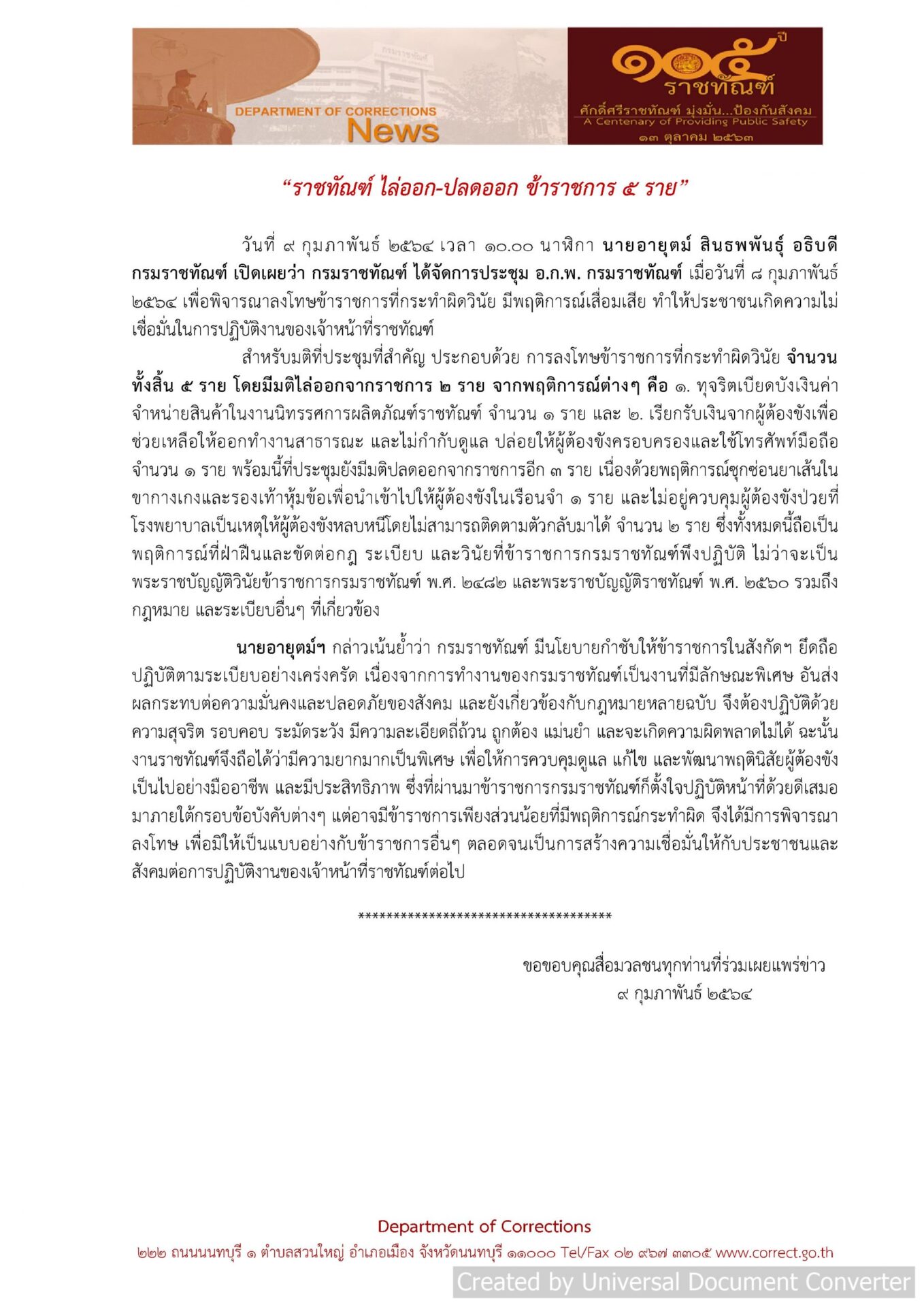 นายอายุตม์ สินธพพันธุ์ อธิบดีกรมราชทัณฑ์ เปิดเผยว่า ในการประชุม อ.ก.พ. กรมราชทัณฑ์ เมื่อวันที่ 8 ก.พ.64 ที่ประชุมมีมติลงโทษข้าราชการที่กระทำผิดวินัย 5 ราย โดยมีมติไล่ออกจากราชการ 2 รายจากพฤติการณ์ คือ 1.ทุจริตเบียดบังเงินค่าจำหน่ายสินค้าในงานนิทรรศการผลิตภัณฑ์ราชทัณฑ์ จำนวน 1ราย และ 2.เรียกรับเงินจากผู้ต้องขังเพื่อช่วยเหลือให้ออกทำงานสาธารณะ และไม่กำกับดูแล ปล่อยให้ผู้ต้องขังครอบครองและใช้โทรศัพท์มือถือ 1 ราย