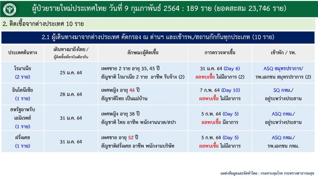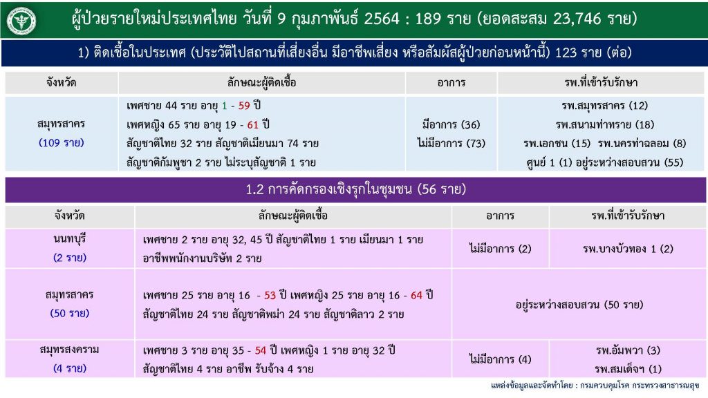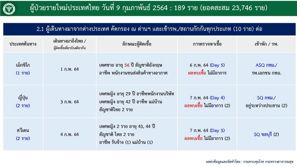 กทม. 9 ก.พ. – ศูนย์ข้อมูล COVID-19 รายงานสถานการณ์การติดเชื้อ COVID-19 ในประเทศ วันอังคารที่ 9 กุมภาพันธ์ 2564 พบผู้ป่วยรายใหม่ 189 ราย ผู้ป่วยยืนยันสะสม 23,746 ราย รักษาหายเพิ่ม 956 ราย หายป่วยแล้ว 18,366 ราย ยังรักษาอยู่ในโรงพยาบาล 5,301 ราย เสียชีวิตสะสม 79 ราย