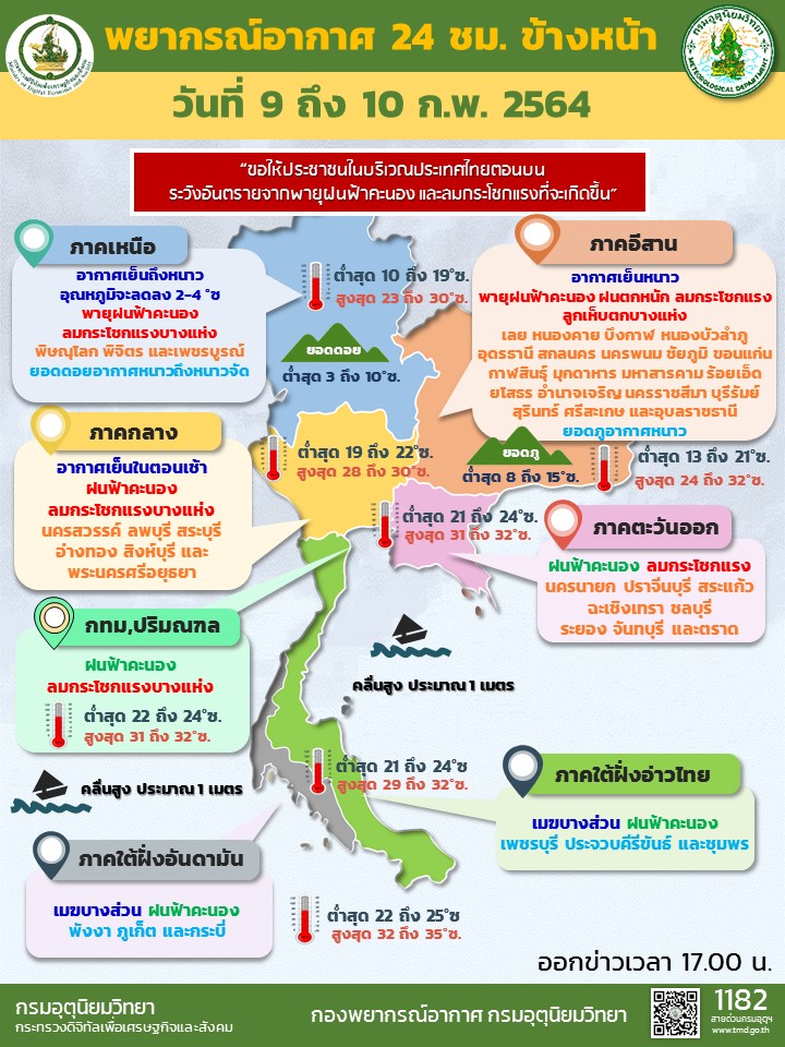 กรมอุตุนิยมวิทยา พยากรณ์อากาศ 24 ชั่วโมงข้างหน้า คลื่นกระแสลมฝ่ายตะวันตกได้เคลื่อนผ่านภาคเหนือ เข้าปกคลุมภาคตะวันออกเฉียงเหนือตอนบน ในขณะที่มีลมใต้และลมตะวันออกเฉียงใต้พัดนำความชื้นจากอ่าวไทยและทะเลจีนใต้เข้ามาปกคลุมภาคตะวันออกเฉียงเหนือตอนล่าง ภาคกลาง ภาคตะวันออก รวมทั้งกรุงเทพมหานครและปริมณฑล ทำให้บริเวณประเทศไทยตอนบนมีฝนฟ้าคะนอง ขอให้ประชาชนในบริเวณดังกล่าวระวังอันตรายจากพายุฝนฟ้าคะนองและลมกระโชกแรงที่จะเกิดขึ้น โดยหลีกเลี่ยงการอยู่ในที่โล่งแจ้ง ใต้ต้นไม้ใหญ่ และป้ายโฆษณาที่ไม่แข็งแรง รวมถึงระวังอันตรายจากฟ้าผ่า เกษตรกรควรเตรียมการป้องกันและระวังความเสียหายที่จะเกิดต่อผลผลิตทางการเกษตรไว้ด้วย