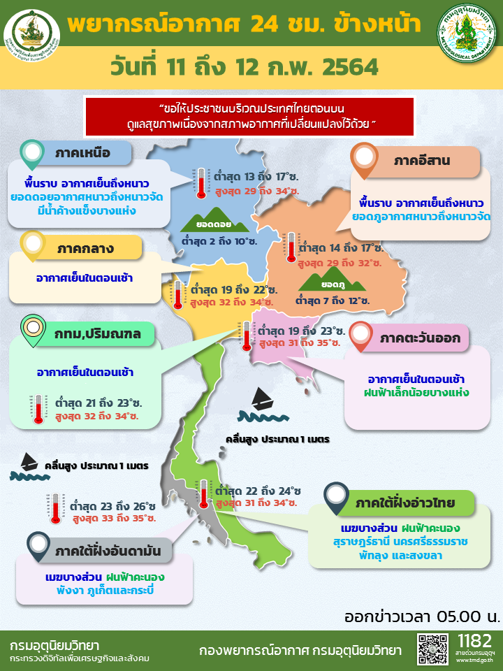 กทม. 11 ก.พ.-กรมอุตุฯ เผยภาคเหนือ-อีสาน อากาศเย็นถึงหนาว ส่วนภาคกลางและภาคตะวันออก รวมทั้งกรุงเทพฯ-ปริมณฑล มีอากาศเย็นตอนเช้า