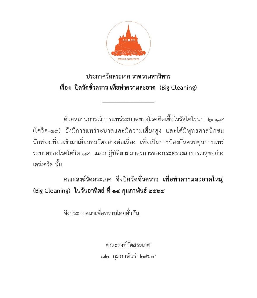 คณะสงฆ์วัดสระเกศ จึงปิดวัดชั่วคราว เพื่อทำความสะอาดใหญ่ (Big Cleaning) ในวันอาทิตย์ที่ 14 กุมภาพันธ์ 2564 .-สำนักข่าวไทย