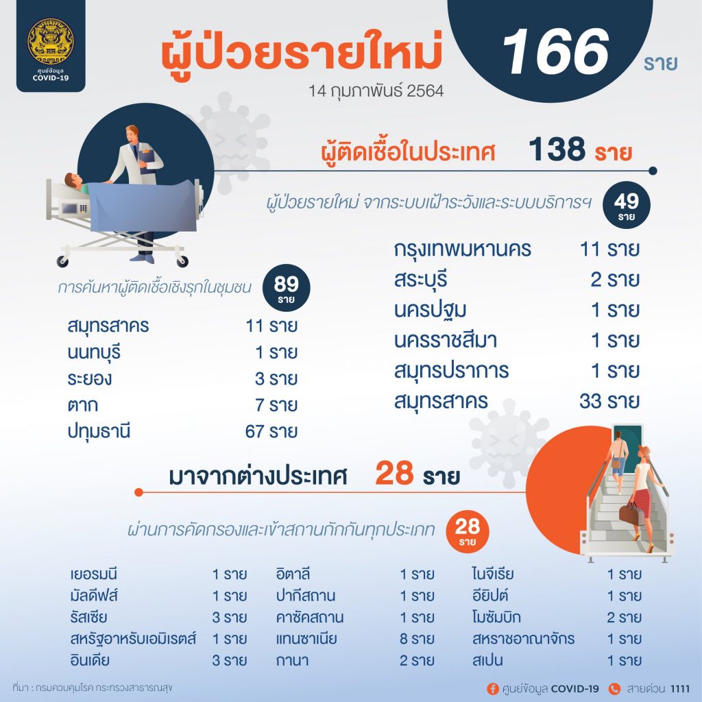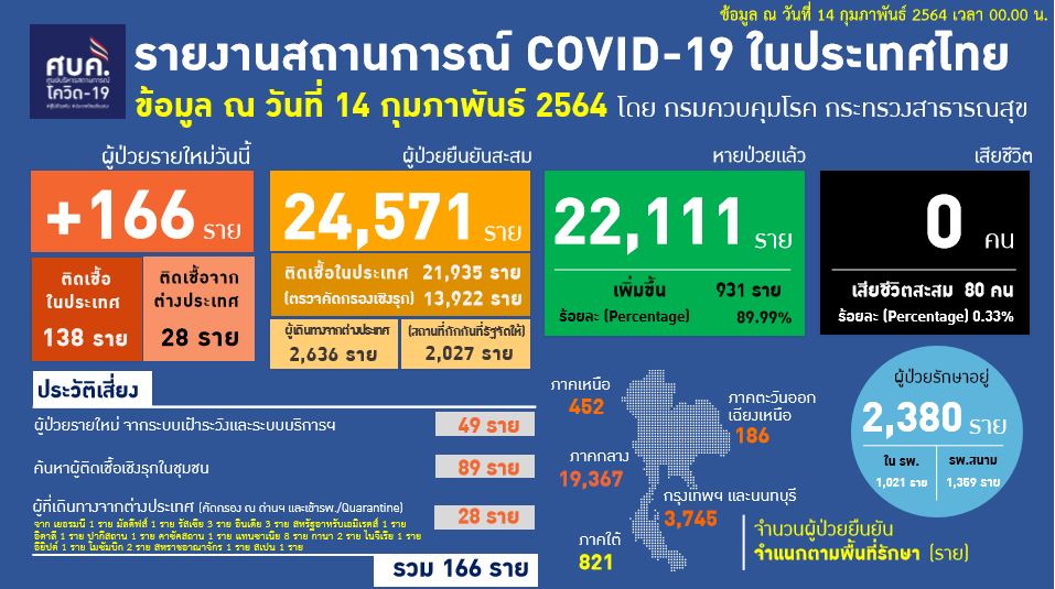 กทม. 14 ก.พ. – ศูนย์ข้อมูล COVID-19 รายงานสถานการณ์การติดเชื้อ COVID-19 ในประเทศ วันอาทิตย์ที่ 14 กุมภาพันธ์ 2564 พบผู้ป่วยรายใหม่ 166 ราย ผู้ป่วยยืนยันสะสม 24,571 ราย รักษาหายเพิ่ม 931 ราย หายป่วยแล้ว 22,111 ราย ยังรักษาอยู่ในโรงพยาบาล 2,380 ราย เสียชีวิตสะสม 80 ราย