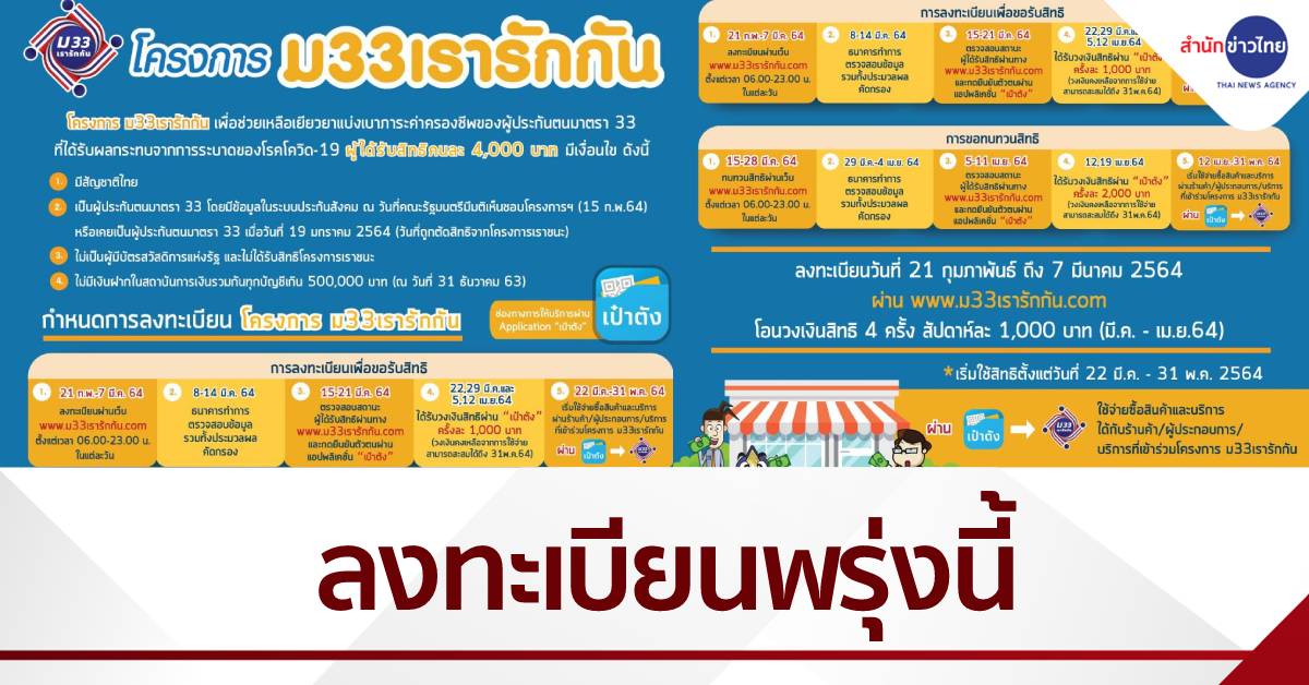 นายทศพล กฤตวงศ์วิมาน เลขาธิการสำนักงานประกันสังคม กระทรวงแรงงาน ได้กล่าวถึง การดำเนินงานโครงการ ม33เรารักกัน ว่า ผู้ประกันตนมาตรา 33 สามารถลงทะเบียนผ่านเว็บไซต์ www. ม33เรารักกัน.com ตั้งแต่วันที่ 21 กุมภาพันธ์ -7 มี.ค.2564 เวลา 06.00-23.00 น. ในแต่ละวัน และขอย้ำให้กดยืนยันตัวตนผ่าน Application “เป๋าตัง” ในวันที่ 15-21 มีนาคม 2564 โดยจะได้รับวงเงินผ่าน “เป๋าตัง” ในวันที่ 22, 29 มีนาคม และ 5, 12 เมษายน 2564 ครั้งละ 1,000 บาท จนครบ 4,000 บาท ทั้งนี้ผู้ประกันตนสามารถเริ่มใช้จ่าย ซื้อสินค้าและบริการผ่านร้านค้า/ผู้ประกอบการ/บริการ ในร้านธงฟ้าที่ใช้ Application “ถุงเงิน” หรือภายใต้โครงการ “คนละครึ่ง” และโครงการ “เราชนะ” ได้ในวันที่ 22 มีนาคม-31 พฤษภาคม 2564