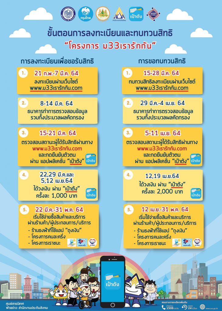 เลขาธิการสำนักงานประกันสังคม กระทรวงแรงงาน ได้กล่าวถึง การดำเนินงานโครงการ ม33เรารักกัน ว่า ผู้ประกันตนมาตรา 33 สามารถลงทะเบียนผ่านเว็บไซต์ www. ม33เรารักกัน.com ตั้งแต่วันที่ 21 กุมภาพันธ์ -7 มี.ค.2564 เวลา 06.00-23.00 น. ในแต่ละวัน และขอย้ำให้กดยืนยันตัวตนผ่าน Application “เป๋าตัง” ในวันที่ 15-21 มีนาคม 2564 โดยจะได้รับวงเงินผ่าน “เป๋าตัง” ในวันที่ 22, 29 มีนาคม และ 5, 12 เมษายน 2564 ครั้งละ 1,000 บาท จนครบ 4,000 บาท ทั้งนี้ผู้ประกันตนสามารถเริ่มใช้จ่าย ซื้อสินค้าและบริการผ่านร้านค้า/ผู้ประกอบการ/บริการ ในร้านธงฟ้าที่ใช้ Application “ถุงเงิน” หรือภายใต้โครงการ “คนละครึ่ง” และโครงการ “เราชนะ” ได้ในวันที่ 22 มีนาคม-31 พฤษภาคม 2564