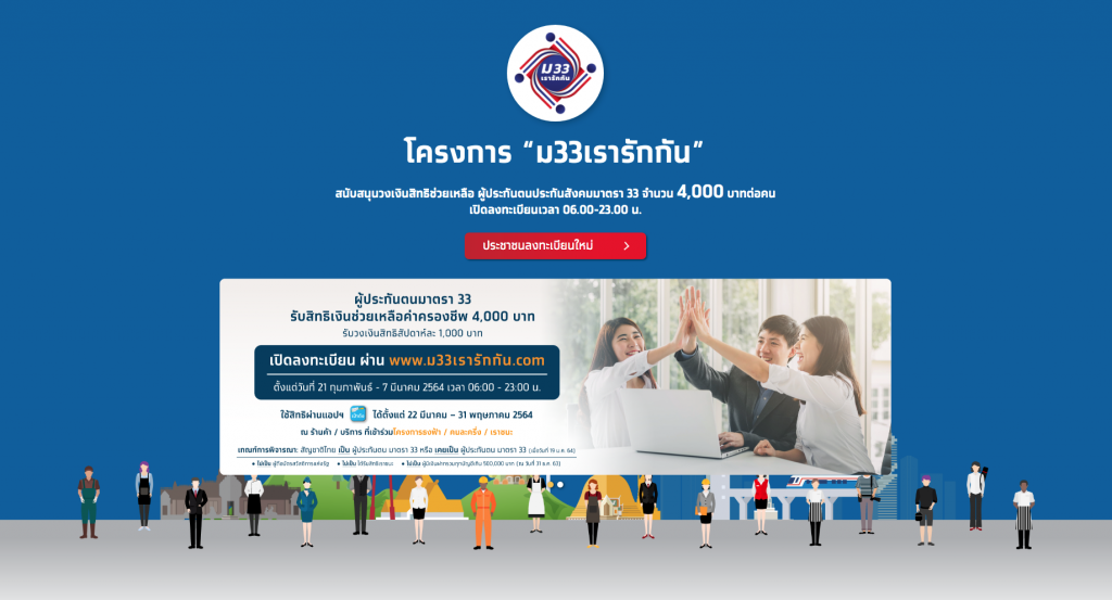 กรุงเทพฯ 21 ก.พ.-เปิดให้ลงทะเบียนแล้ว โครงการ “ม33เรารักกัน” รับเงินเยียวยา 4,000 บาท/คน แบ่งจ่ายสัปดาห์ละ 1,000 จนครบสิทธิ เช้านี้ ระบบไม่ล่ม ใช้เวลาไม่นาน