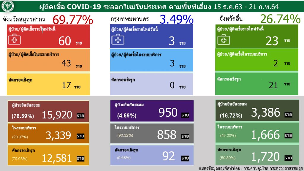 ทั้งนี้จำนวนผู้ติดเชื้อโควิด-19 จากการระบาดระลอกใหม่ ตั้งแต่วันที่ 15 ธันวาคม 2563 – 21 กุมภาพันธ์ 2564 มีผู้ป่วยสะสมแล้ว 20,108 คน จังหวัดที่พบผู้ติดเชื้อมากที่สุด 5 ดันดับแรก คือ สมุทรสาคร 15,920 คน รองลงมาเป็นกรุงเทพมหานคร 950 คน ชลบุรี 653 คน ระยอง 584 คน และปทุมธานี 501 คน .-สำนักข่าวไทย