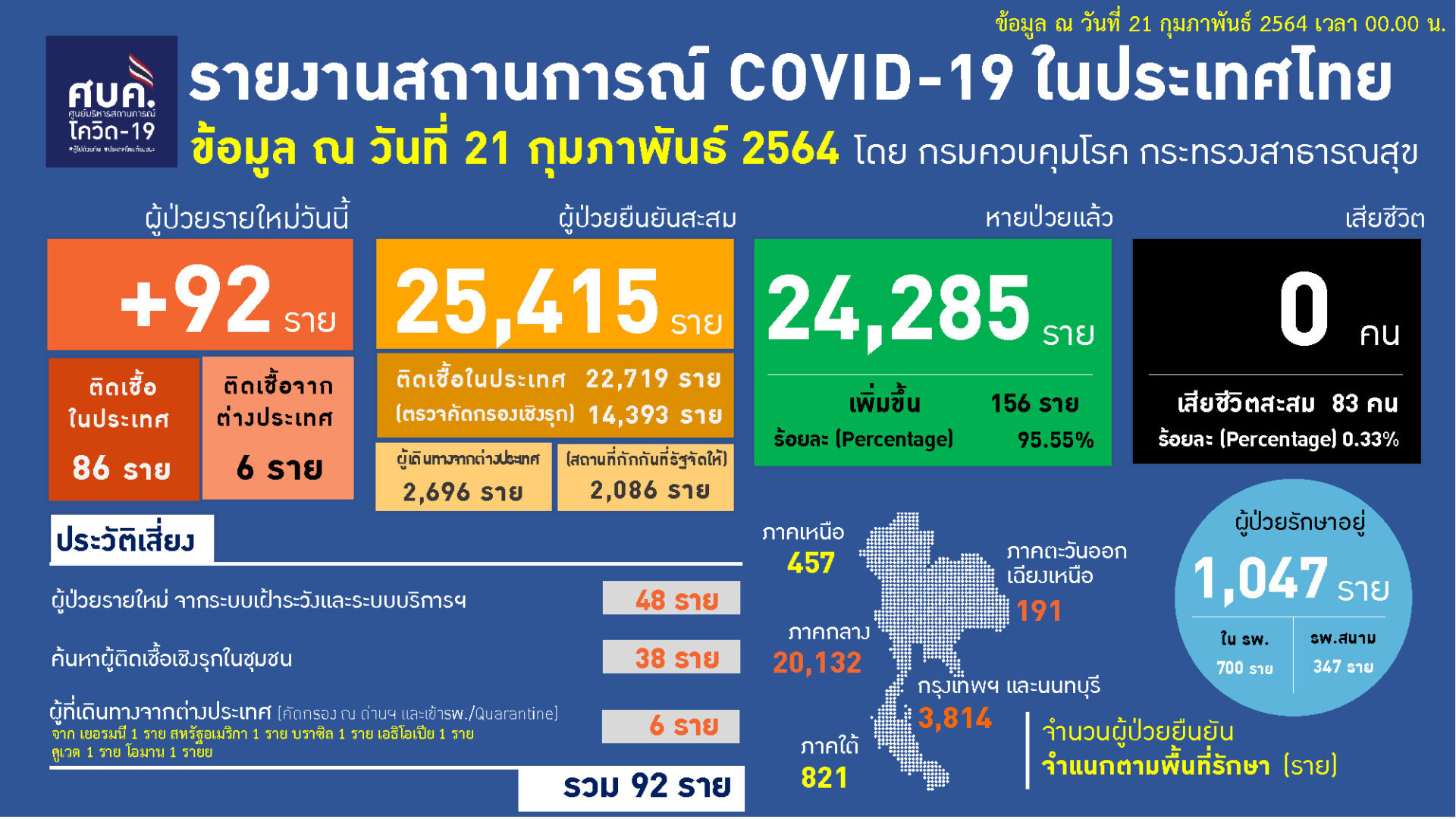 ศูนย์บริหารสถานการณ์โควิด-19 หรือ ศบค. รายงานตัวเลขผู้ติดเชื้อโควิด-19 วันนี้ (21 กุมภาพันธ์ 2564) พบผู้ติดเชื้อใหม่ 92 คน แบ่งเป็นติดเชื้อในประเทศ 86 ราย และติดเชื้อจากต่างประเทศอยู่ในสถานกักกันของรัฐ 6 คน รวมผู้ป่วยสะสม 25,415 คน ส่วนผู้เสียชีวิตสะสมยอดเท่าเดิม 83 คน