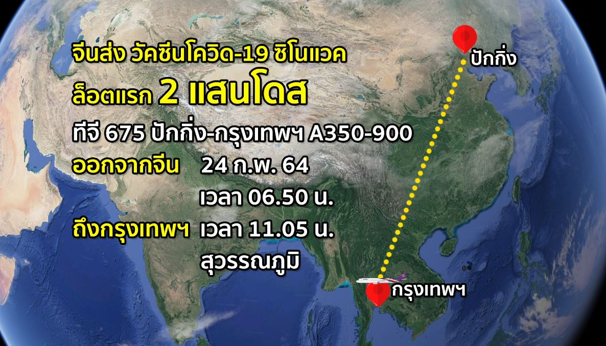ส่วนความคืบหน้าวัคซีน covid-19 จากบริษัท Sinovac จากประเทศจีน อีก 2 วัน คือวันพุธที่ 24 ก.พ.นี้ จัดส่งมาถึงท่าอากาศยานสุวรรณภูมิ โดยเที่ยวบินขนส่งสินค้า (Cargo) เที่ยวบินที่ TG 675 เส้นทางปักกิ่ง-กรุงเทพฯ ออกเดินทางจากสาธารณรัฐประชาชนจีน เวลา 06.00 น. (เวลาท้องถิ่น) ถึงกรุงเทพฯ เวลาประมาณ 10.00 น. ที่คลังสินค้า การบินไทย ท่าอากาศยานสุวรรณภูมิ ซึ่งในวันดังกล่าว พล.อ.ประยุทธ์ จันทร์โอชา นายกรัฐมนตรี จะเข้ารับมอบด้วย.-สำนักข่าวไทย