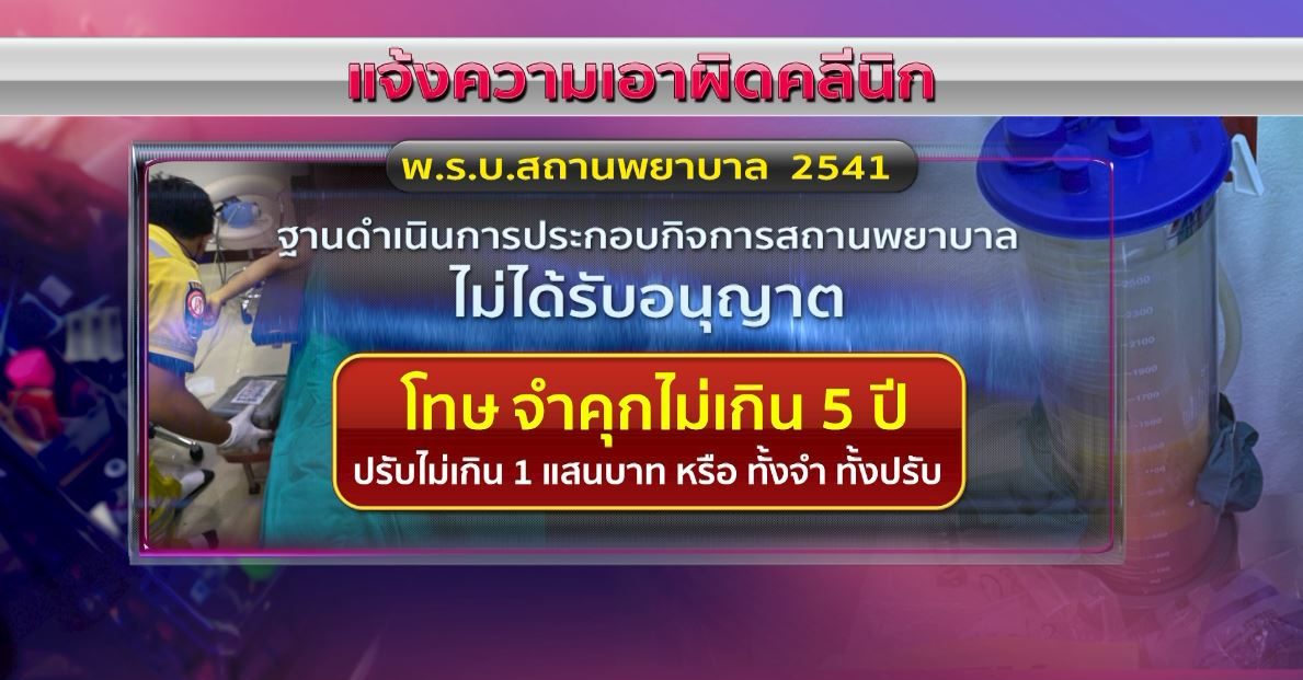 และเปิดบริการไม่ตรงกับเวลาที่ขออนุญาต คือช่วงเวลา 17.00-20.00 น. แต่เจ้าหน้าที่ทราบว่าคลินิกให้บริการเวลา 12.00-14.00 น. ทาง สบส.เตรียมไปแจ้งความในฐานดำเนินการประกอบกิจการสถานพยาบาลไม่ได้รับอนุญาต ตาม พ.ร.บ.สถานพยาบาล 2541 โทษจำคุกไม่เกิน 5 ปี ปรับไม่เกิน 1 แสนบาท หรือทั้งจำทั้งปรับ แต่จะยังไม่สั่งปลดสถานประกอบการ เพราะยังไม่ใช่ข้อหาร้ายแรง นอกจากนี้ ทาง สบส.จะทำหนังสือเชิญหมอที่ดำเนินการหัตถการมา ให้ข้อมูลกับแพทย์สภา เพื่อพิจารณาว่าดำเนินการตามมาตรฐานวิชาชีพหรือไม่ ซึ่งได้รับการบอกเล่าว่า หมอที่ทำการหัตถการ ได้พยายามช่วยฟื้นคืนชีพแล้ว แต่ไม่สำเร็จ