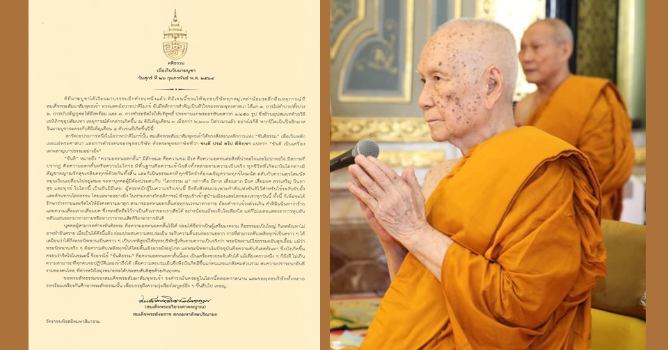 กรุงเทพฯ25 ก.พ.-เนื่องในวันมาฆบูชา สมเด็จพระสังฆราช แนะชาวพุทธน้อมนำหลักธรรมพระพุทธเจ้า ทรงสั่งสอนหลักการแห่งขันติธรรม ดำรงตนเป็นพุทธบริษัท ดังพระพุทธภาษิต “ขนฺตี ปรมํ ตโป ตีติกฺขา” แปลว่า “ขันติ เป็นเครื่องเผาผลาญบาปธรรมอย่างยิ่ง”