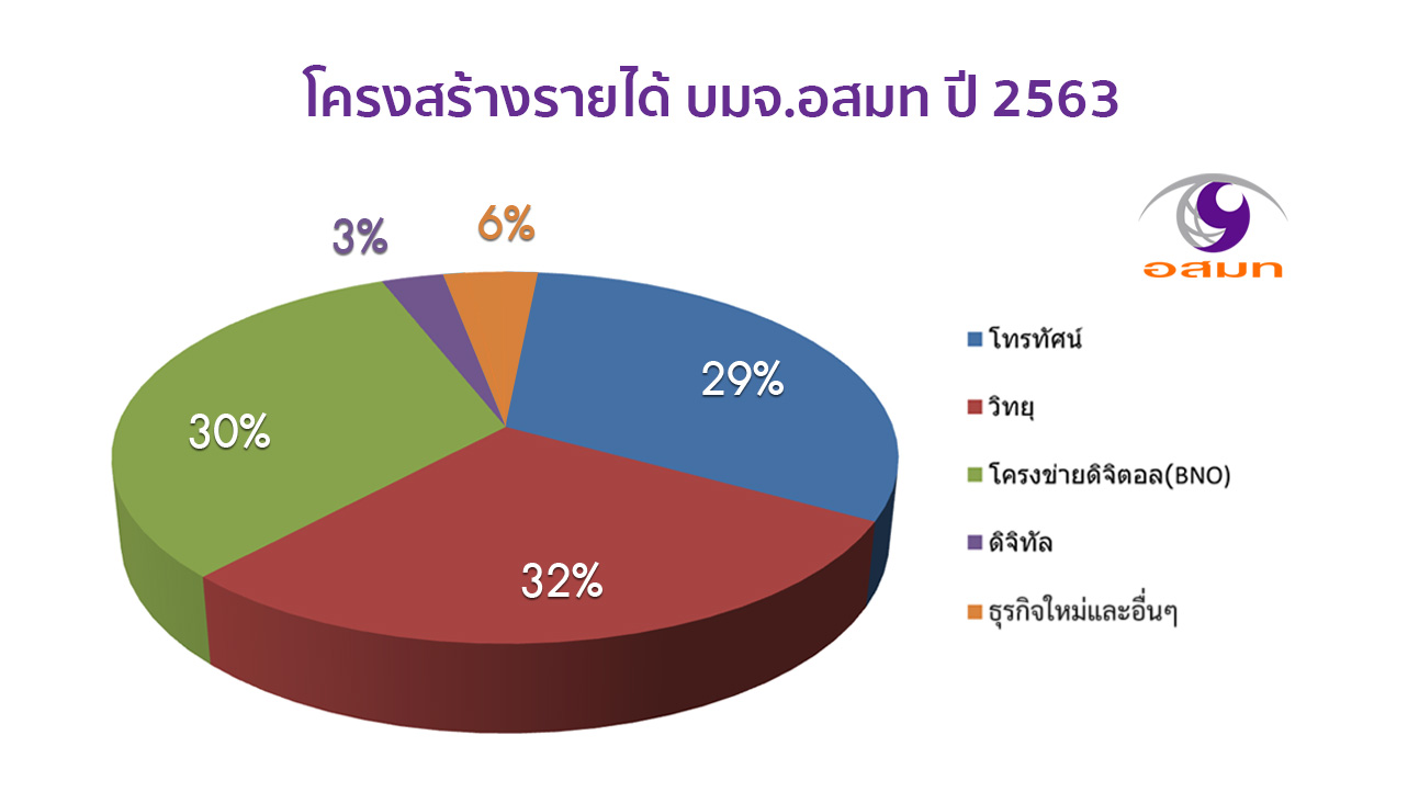 ผลการดำเนินงานปี 2563 ธุรกิจโทรทัศน์และธุรกิจวิทยุ ยังคงเป็นธุรกิจหลักที่สามารถสร้างรายได้สูงสุดให้กับ อสมท คิดเป็นสัดส่วนร้อยละ 61 ของรายได้รวมทั้งหมด โดยธุรกิจวิทยุมีโครงสร้างรายได้ ร้อยละ 32 ธุรกิจให้บริการโครงข่ายโทรทัศน์ภาคพื้นดินระบบดิจิตอล (BNO) ร้อยละ 30 ธุรกิจโทรทัศน์ ร้อยละ 29 ธุรกิจดิจิทัล ร้อยละ 3 ธุรกิจใหม่และอื่นๆ ร้อยละ 6”