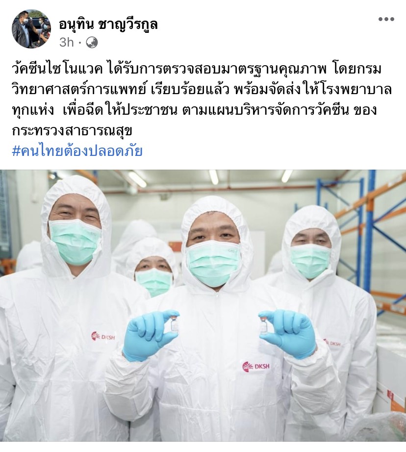 ผู้สื่อข่าวรายงานว่า เพจเฟซบุ๊ก “อนุทิน ชาญวีรกูล” ของนายอนุทิน ชาญวีรกูล รองนายกรัฐมนตรีและรัฐมนตรีว่าการกระทรวงสาธารณสุข ปรากฏข้อความว่า วัคซีน Sinovac ได้รับการตรวจสอบมาตรฐานคุณภาพ โดยกรมวิทยาศาสตร์การแพทย์ เรียบร้อยแล้ว พร้อมจัดส่งให้โรงพยาบาลทุกแห่ง เพื่อฉีดให้ประชาชน ตามแผนบริหารจัดการวัคซีนของกระทรวงสาธารณสุข
