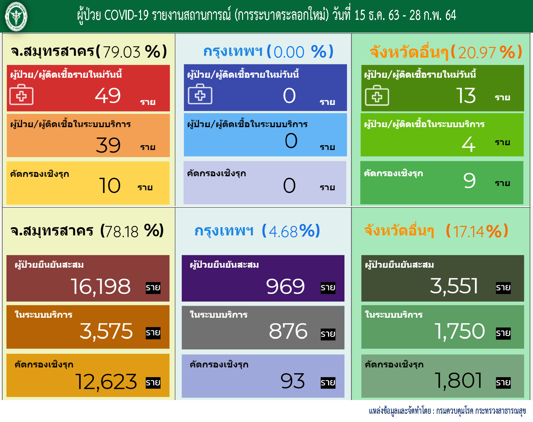 ศบค.รายงานวันนี้ (28 ก.พ.) พบผู้ติดเชื้อโควิด-19 รายใหม่เพิ่มขึ้น 70 ราย เป็นผู้ป่วยใหม่จากระบบเฝ้าระวังและระบบบริการ 43 ราย จากการค้นหาเชิงรุก 19 ราย และเป็นผู้ที่เดินทางมาจากต่างประเทศและเข้าอยู่ในสถานที่กักกันที่รัฐจัดให้ 8 ราย รวมผู้ป่วยยืนยันสะสมล่าสุด 25,951 ราย ยังรักษาตัวในโรงพยาบาล 740 ราย และยอดผู้เสียชีวิตคงที่ 83 ราย