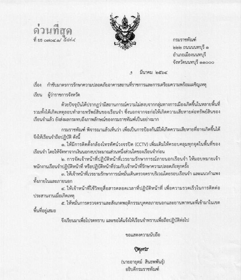 นายอายุตม์ สินธพพันธุ์ อธิบดีกรมราชทัณฑ์ ส่งหนังสือด่วนที่สุดถึงผู้ว่าราชการจังหวัด ลงวันที่ 3 มีนาคม 2564 เรื่องกำชับมาตรการรักษาความปลอดภัยอาคารสถานที่ราชการและการเตรียมความพร้อมเผชิญเหตุ