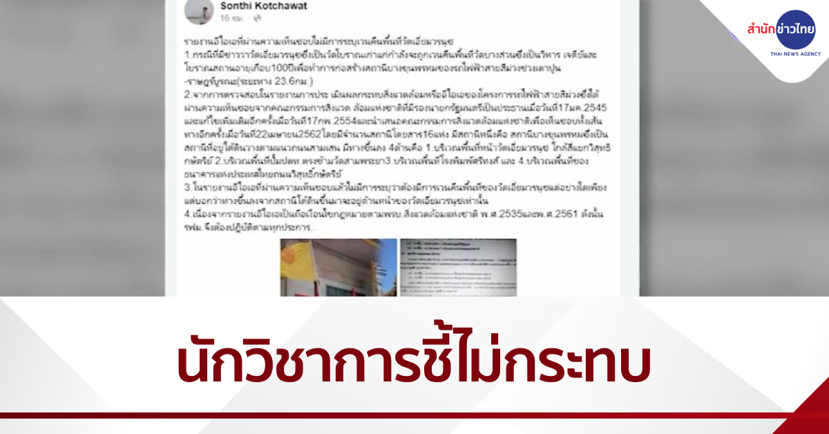 กรุงเทพฯ 5 มี.ค. – นักวิชาการสิ่งแวดล้อมชี้เวนคืนที่วัดเอี่ยมวรนุช สร้างสถานีรถไฟฟ้าบางขุนพรหม ต้องยึดตาม EIA ที่ระบุชัดเจนไม่มีการเวนคืน ด้าน รฟม. ยืนยันไม่เวนคืนที่วัดเอี่ยมวรนุช พร้อมชี้แจงทำความเข้าใจกับวัด