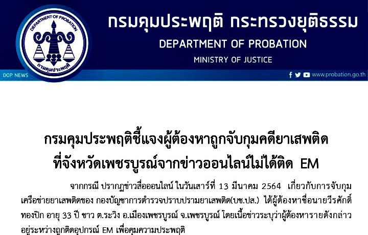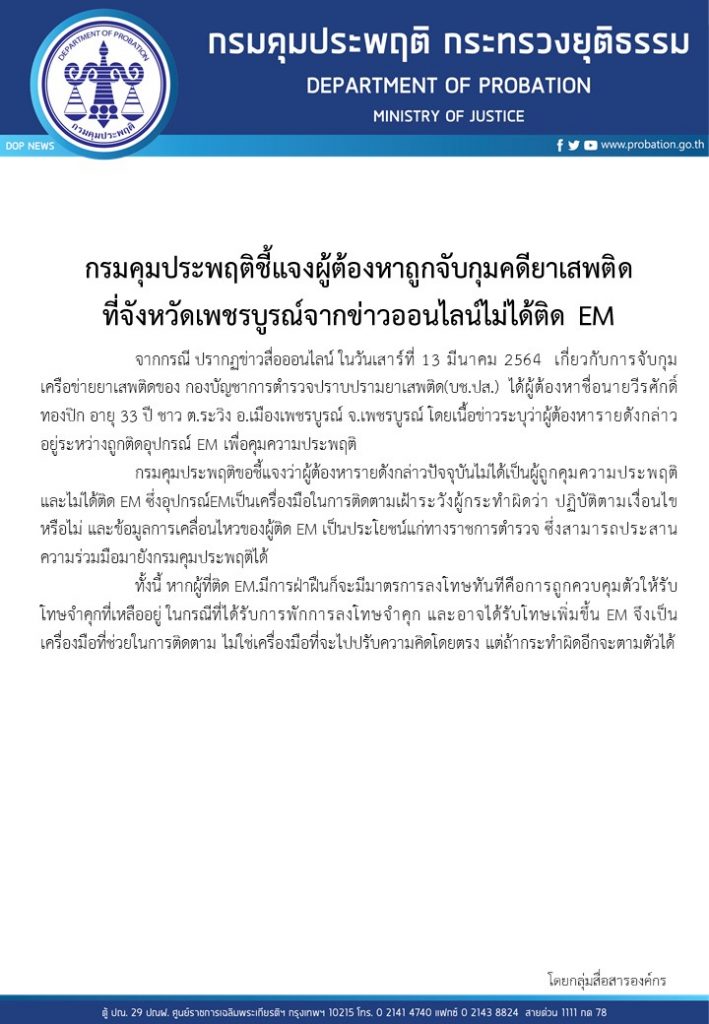 14 มี.ค.- กรมคุมประพฤติชี้แจงผู้ต้องหาถูกจับกุมคดียาเสพติดที่จังหวัดเพชรบูรณ์จากข่าวออนไลน์ไม่ได้ติด EM
