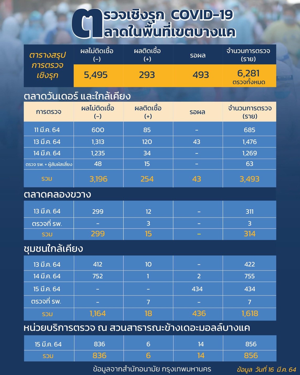 กทม.17 มี.ค.-กทม.เผยข้อมูล ณ วันที่ 16 มี.ค.64 ตรวจคัดกรองเชิงรุกตลาดในพื้นที่เขตบางแค พบติดเชื้อโควิด-19 เพิ่มขึ้น 69 คน ยอดสะสม 293 คน รอผลตรวจอีก 493 คน