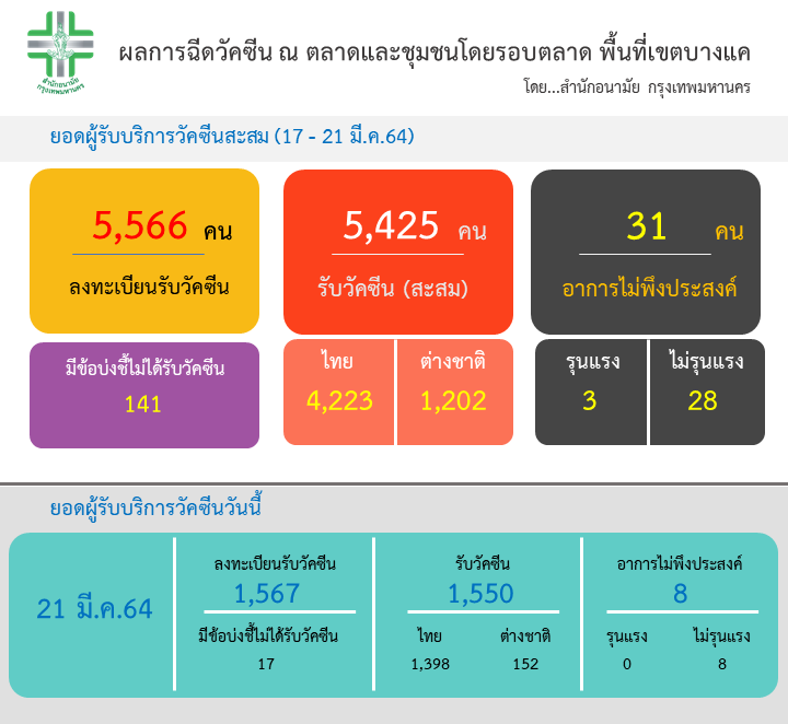 นายชวินทร์ ศิรินาค รองปลัดกรุงเทพมหานคร เปิดเผยถึงผลการฉีดวัคซีนโควิด-19 กลุ่มเสี่ยง ย่านตลาดบางแค โดยหน่วยบริการฉีดวัคซีนนอกสถานที่ ณ วัดนิมมานรดี เขตภาษีเจริญ ในวันนี้ (21 มี.ค.) ซึ่งเป็นวันที่ 5 ของการให้บริการ มีผู้ลงทะเบียน จำนวน 1,567 ราย ได้รับการฉีดวัคซีน จำนวน 1,550 ราย ไม่ได้รับการฉีด จำนวน 17 ราย เนื่องจากสภาพร่างกายไม่พร้อมตามการวินิจฉัยของแพทย์ เช่น มีความดันโลหิตสูง ในส่วนของผู้ที่ได้รับวัคซีนวันนี้ มีผู้มีอาการหน้ามืดวิงเวียนเล็กน้อย 8 ราย และมีอาการปกติหลังนั่งพัก 30 นาที