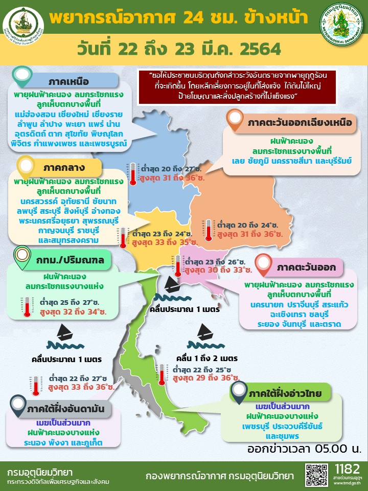 กรมอุตุนิยมวิทยา ออกประกาศเตือน “พายุฤดูร้อนบริเวณประเทศไทย (มีผลจนถึงวันที่ 22 มีนาคม 2564)” ฉบับที่ 9 ลงวันที่ 22 มีนาคม 2564
